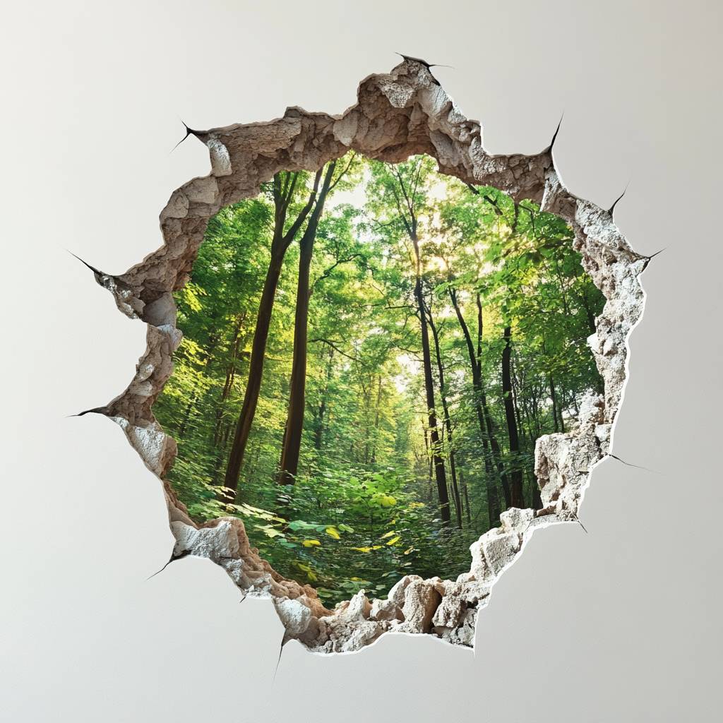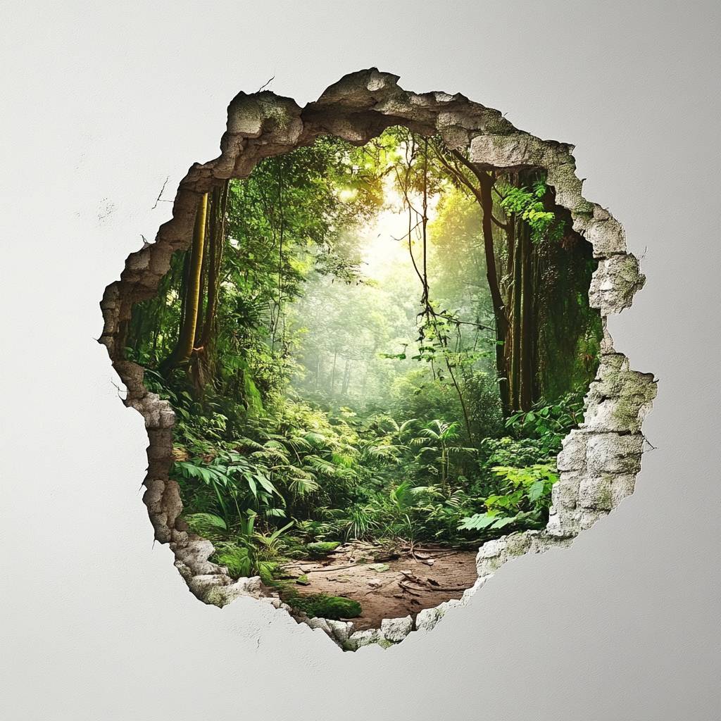 Um buraco na parede branca leva a uma floresta verde luxuosa