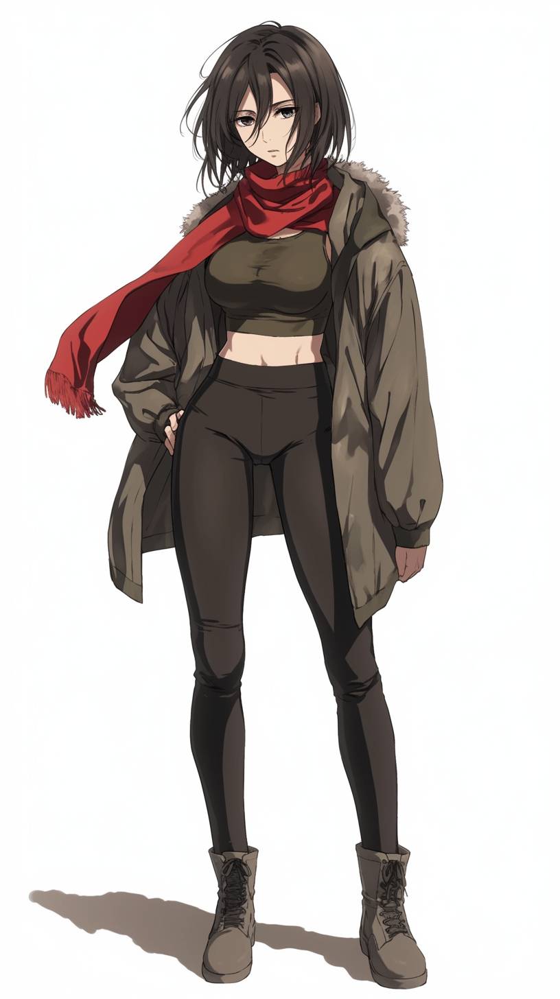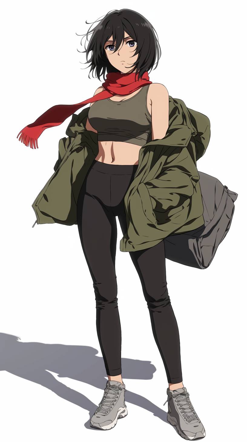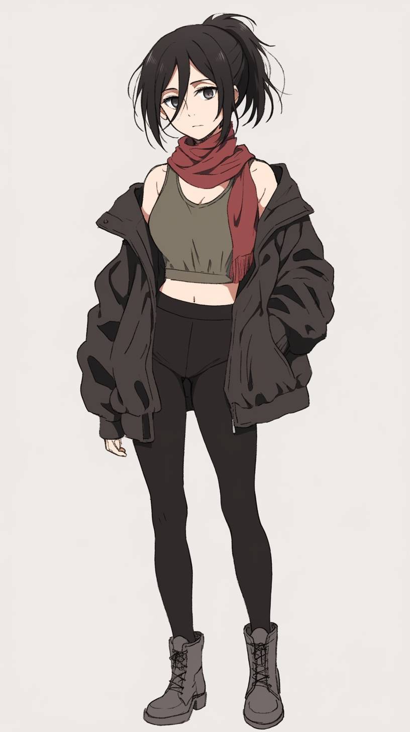 Mikasa Ackerman (Attack on Titan - Military Athleisure): Black high-waisted yoga pants, olive green sports tank top, cropped black bomber jacket, gray ankle boots, and a red scarf. --niji 6 --ar 9:16