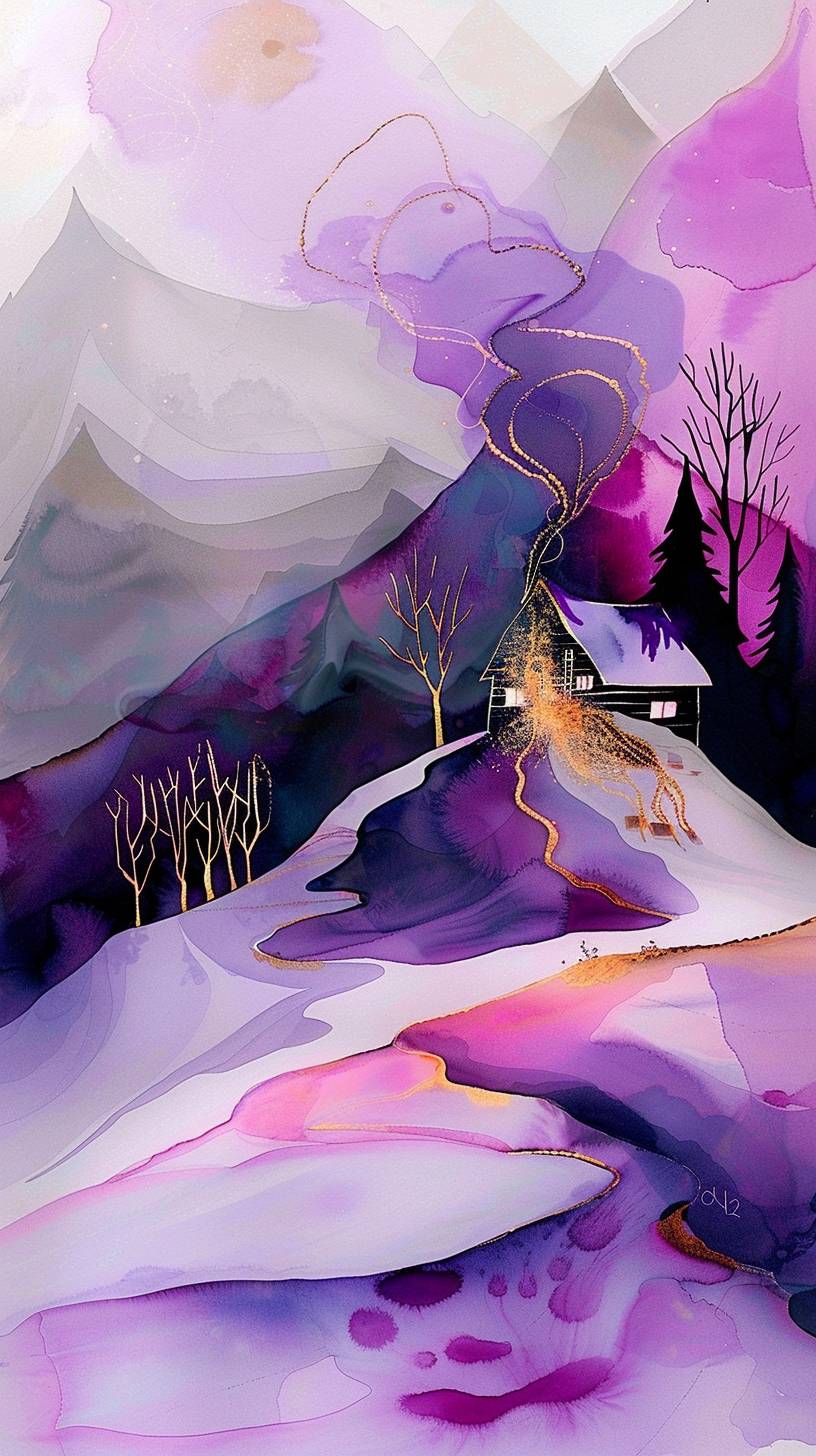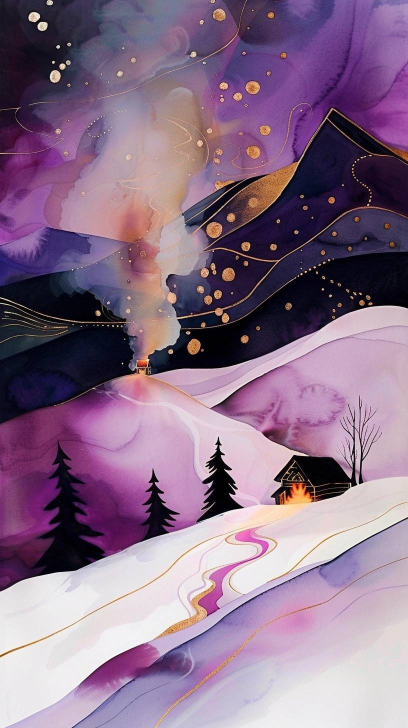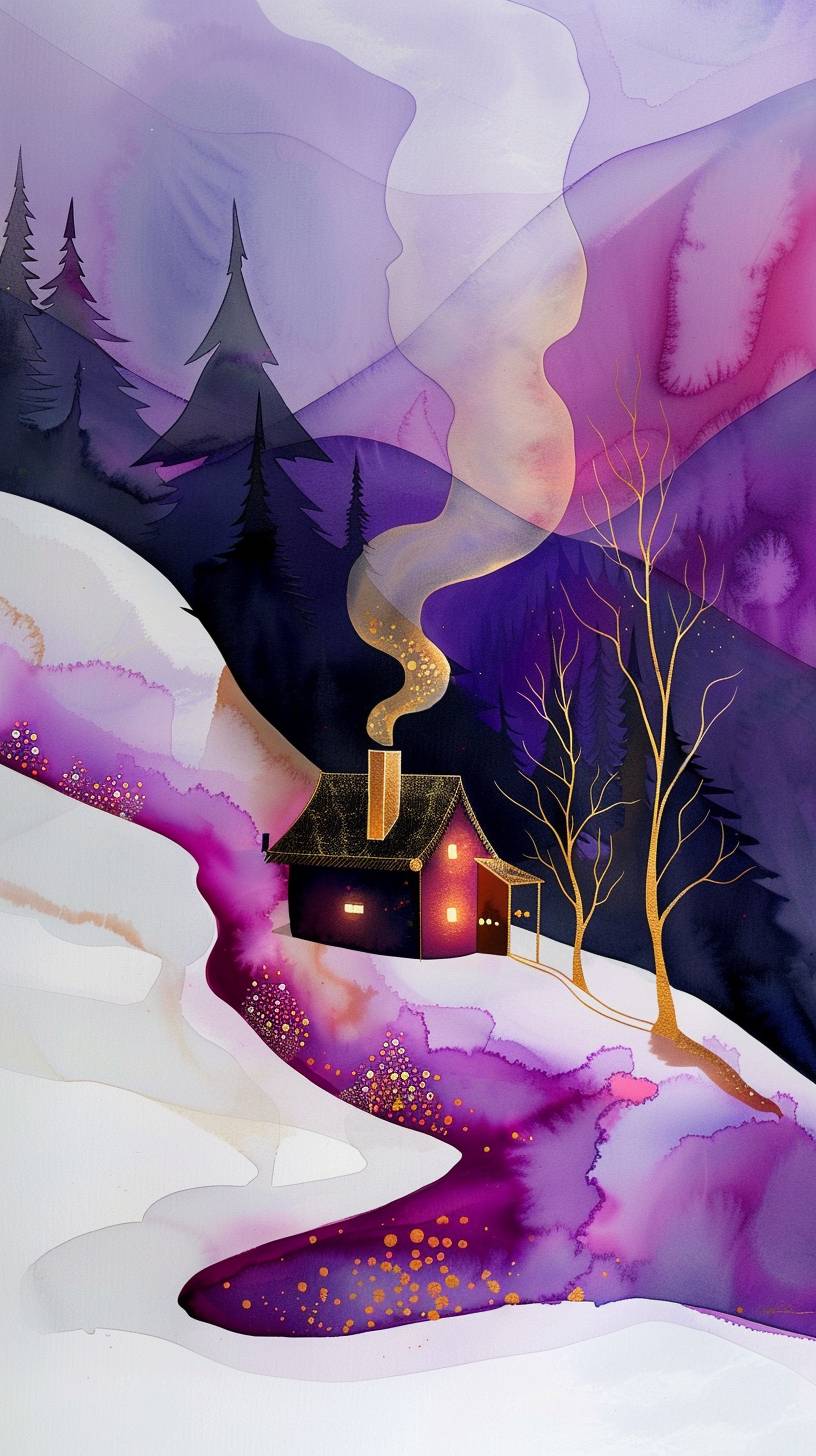 A cozy cabin nestled in the snowy mountains. Smoke is coming out of the chimney, indicating a warm fire inside. In the style of a hand-drawn illustration. --sref 2866862922 --ar 9:16 --v 6.0