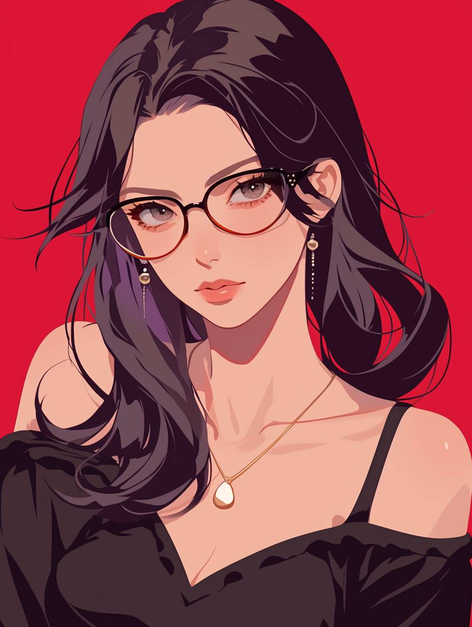 Josei style.Black long hair, glasses, black dress with sleeves, anime-style, red background, flat illustration style, cute cartoon girl avatar, wearing a necklace, cool expression, high detail, clear lines and shadows, in the style of. --ar 3:4 --niji 6