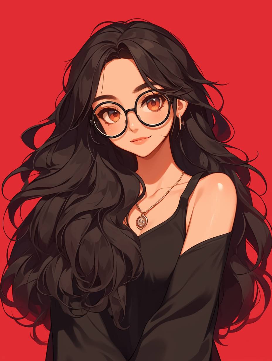 Estilo Josei. Cabelo longo preto, óculos, vestido preto com mangas, estilo anime, fundo vermelho, estilo de ilustração plana, avatar de menina de desenho animado fofa, usando um colar, expressão legal, alta detalhe, linhas e sombras claras, em um estilo único.