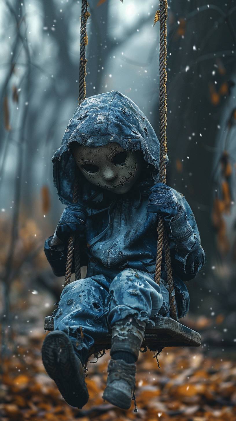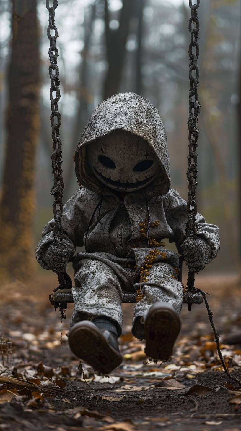 Um fantasma infantil com um sorriso creepy sentado em um balanço em um parque em ruínas.