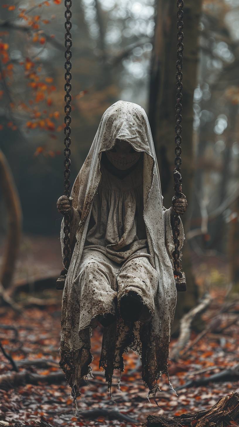 A child ghost with a creepy smile sitting on a swing in a decayed park.photo realistic.captured with Sony Alpha 7R IV, FE 135mm F1.8 GM lens, --ar 9:16 --stylize 750 --v 6.0