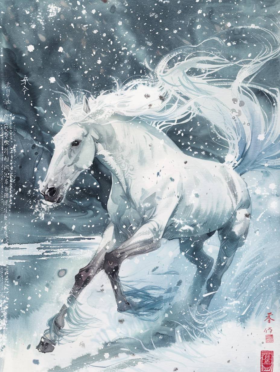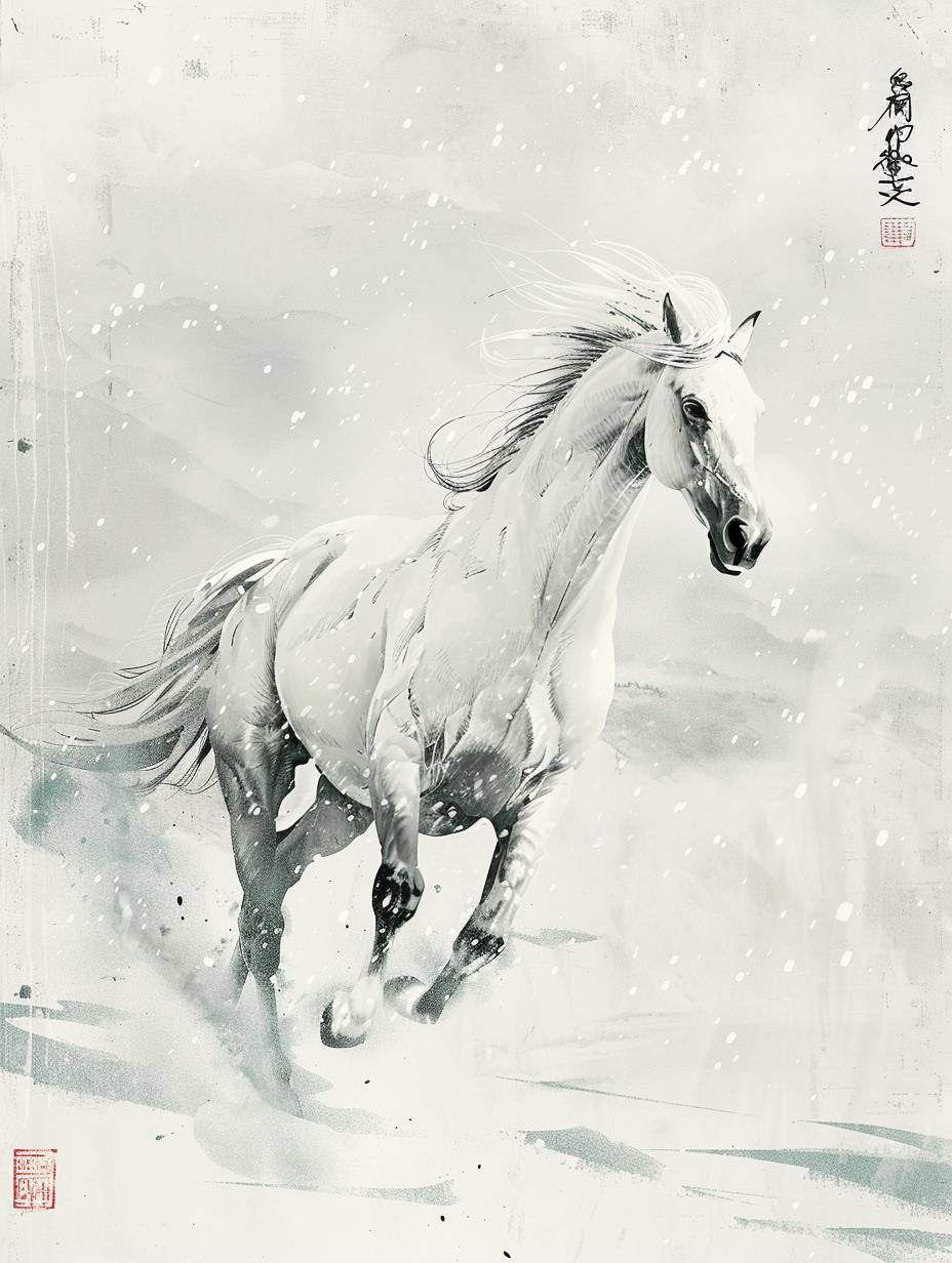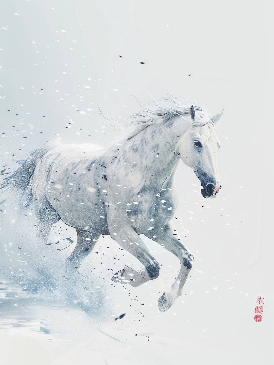 Fundo branco, estilo de tinta chinesa, um cavalo branco correndo no vento e na neve, neve azul gelo, voltado para o público, um desenho simples retratando elementos de fantasia, composição de perspectiva exagerada, linhas minimalistas, criando um sabor único da antiga China. Existem poemas chineses e selos vermelhos.