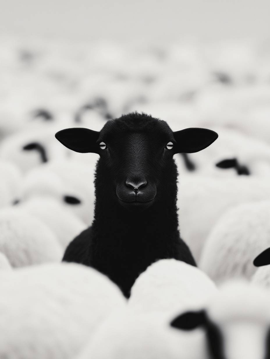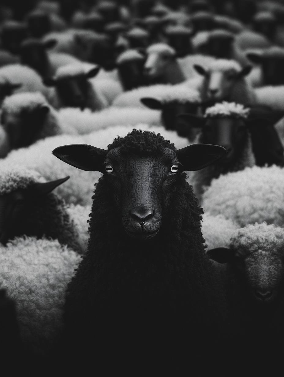 Hyperrealistic, editorial photo of a black sheep in the middle of hundreds of very white sheep, facing the camera, black and white photography, studio lighting, medium shot, in the style of Nick Knight and Jeanloup Sieff. Super realistic, 8k, ultra-detailed, cinematic --ar 3:4 --profile m34x6de --stylize 250 --v 6.1