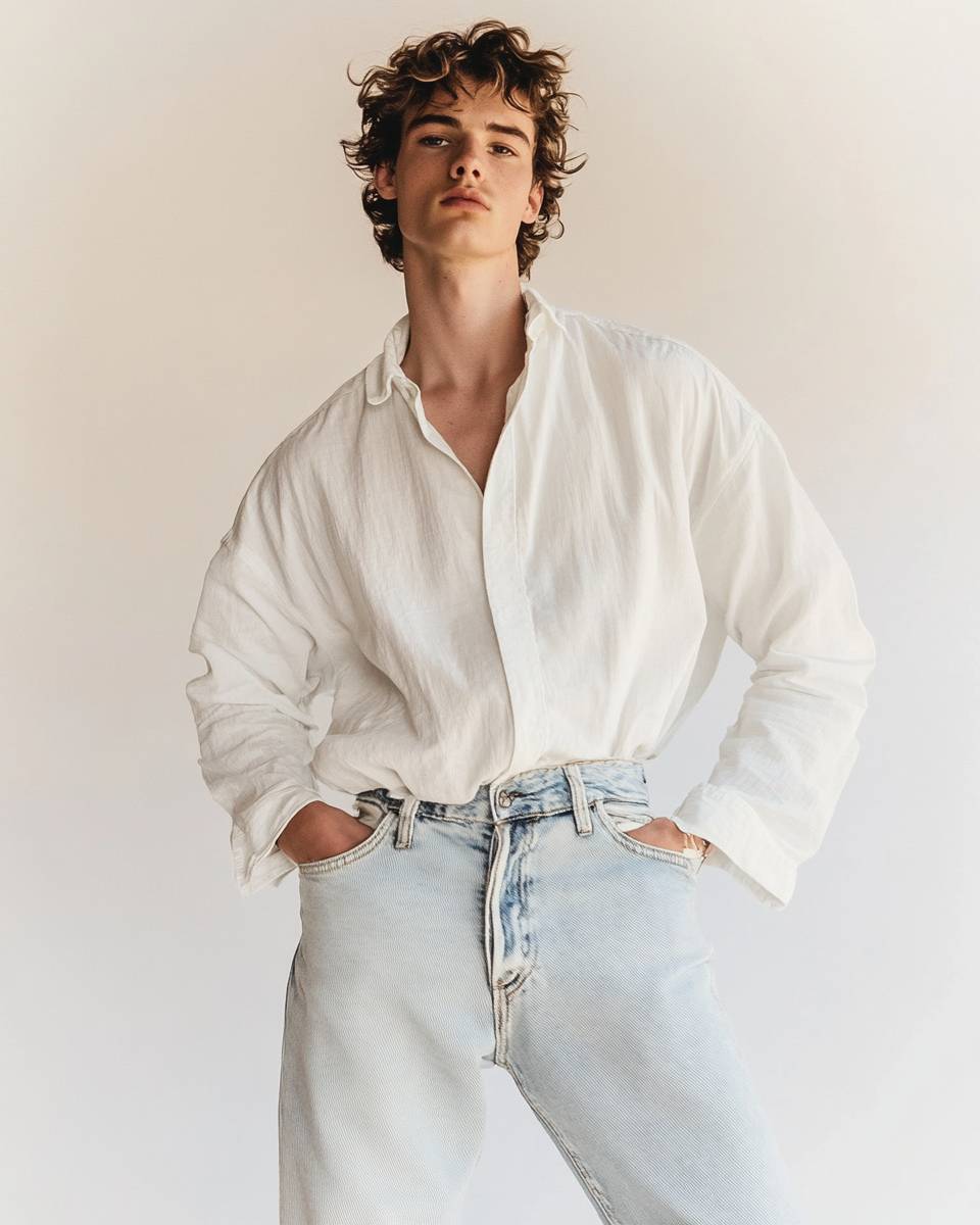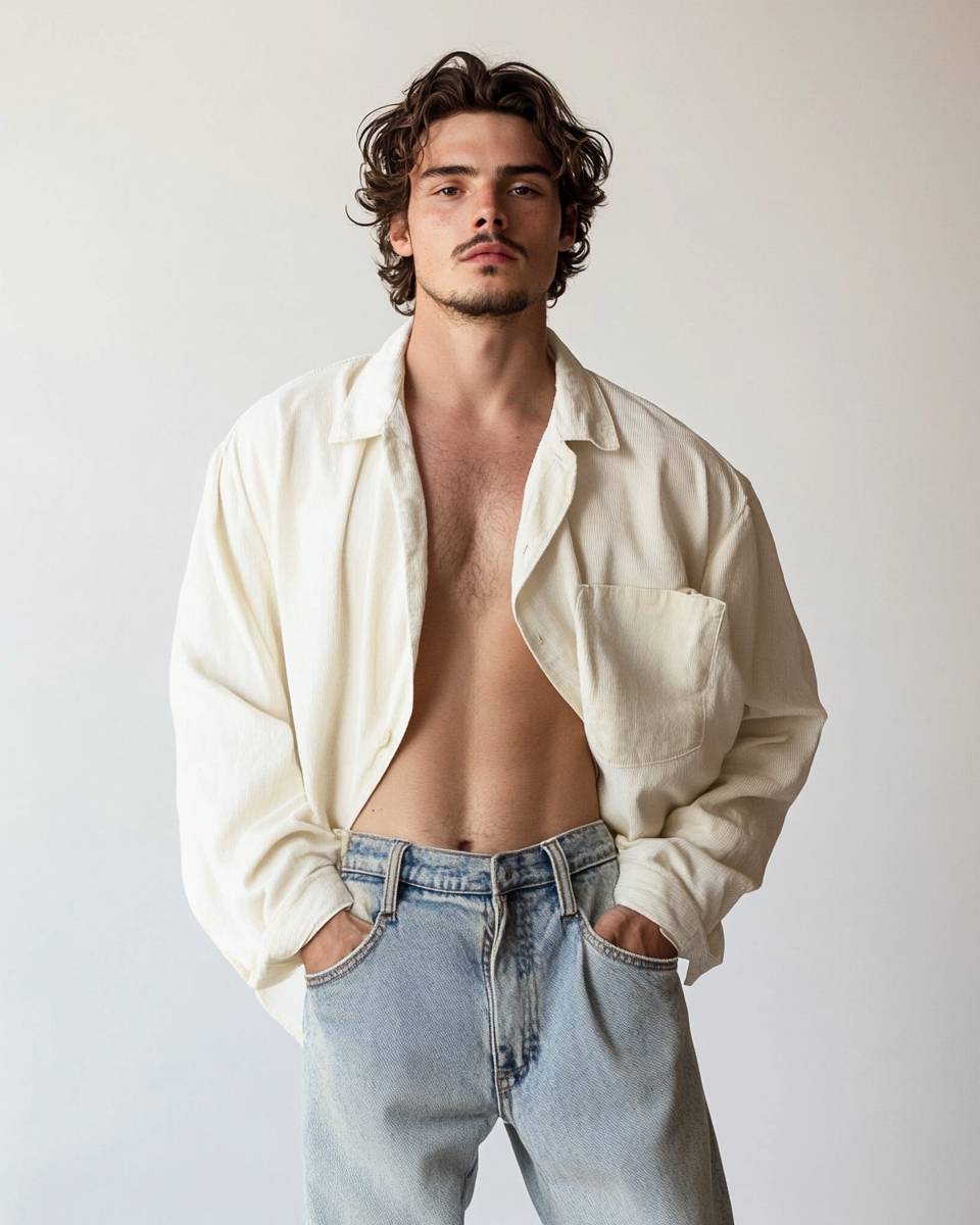Um homem vestindo uma camisa branca solta e jeans de lavagem retro modelo sobre um fundo branco em uma sessão de fotos vintage.