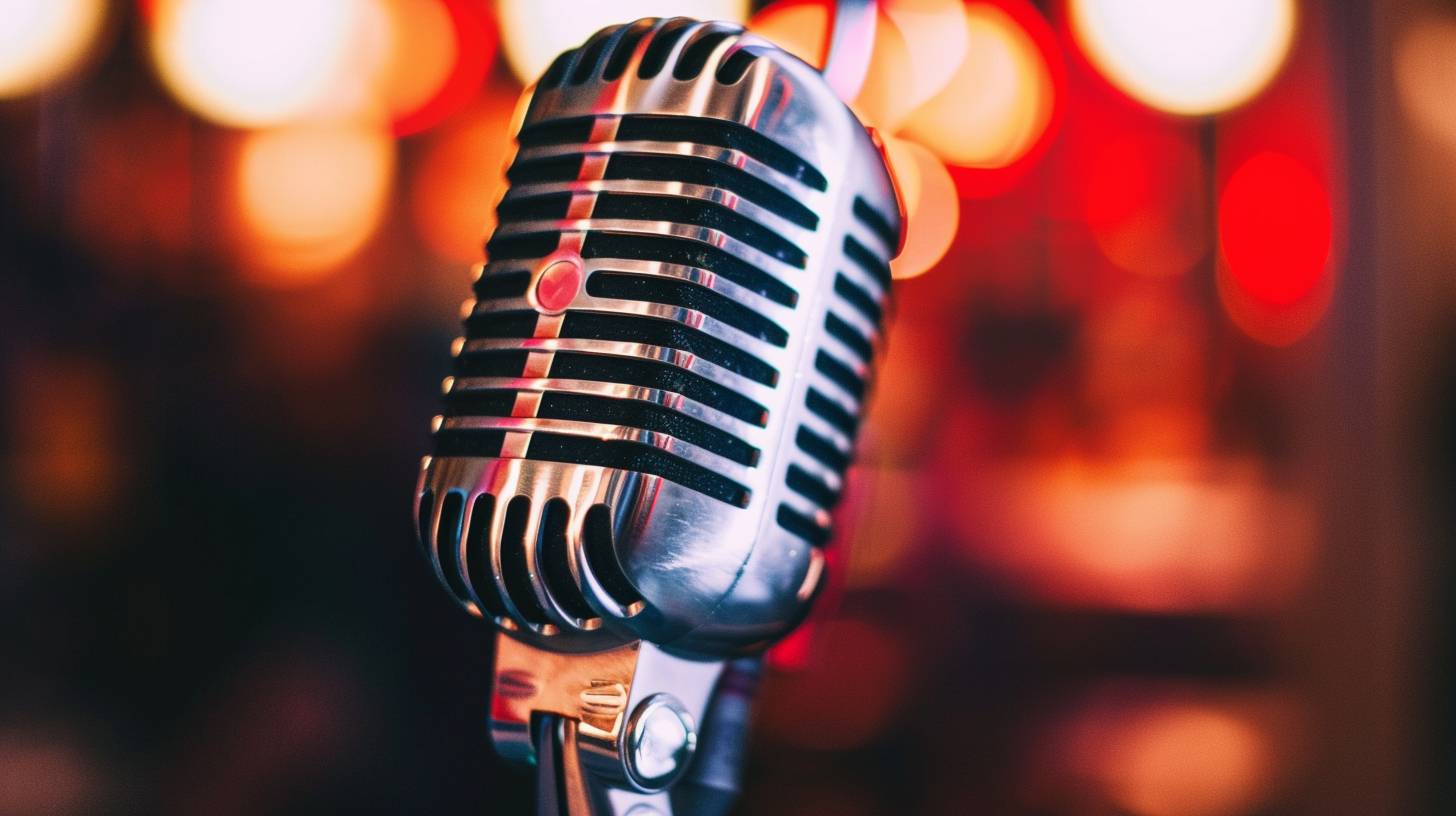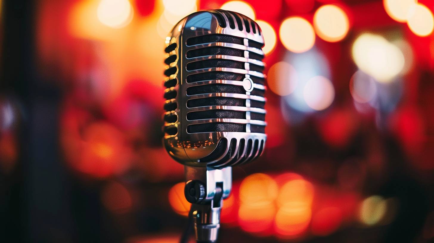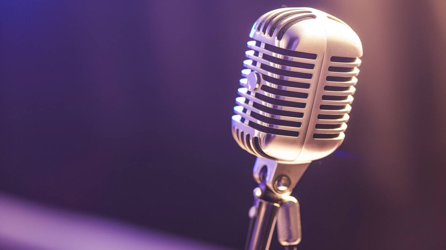 Um microfone de radiodifusão antiquado usado em gravações de voz ou programas de rádio.