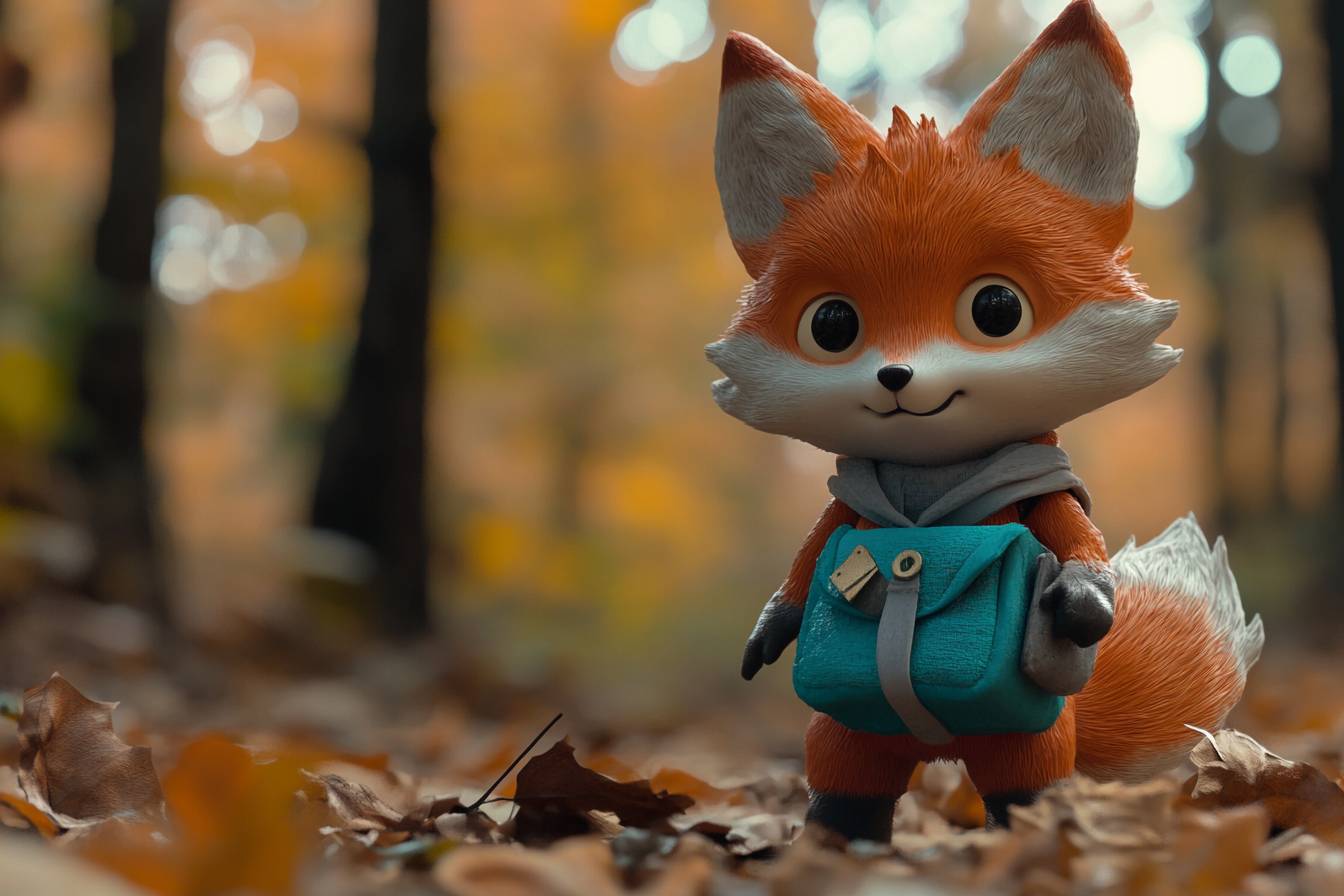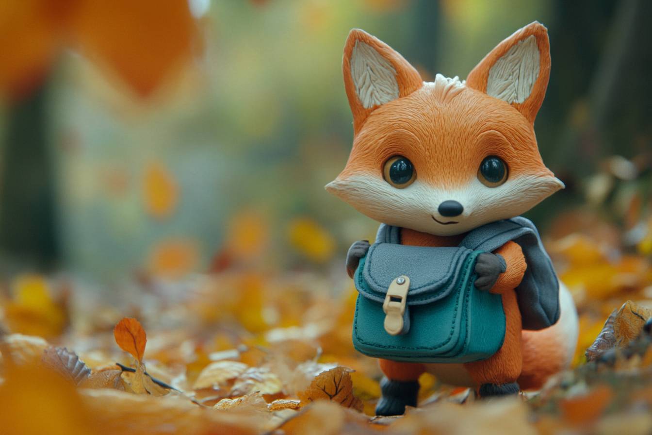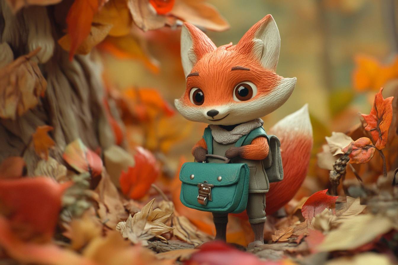 Playful baby fox, wearing a teal and grey messenger bag, the autumn woods, claymation animation style. --ar 3:2