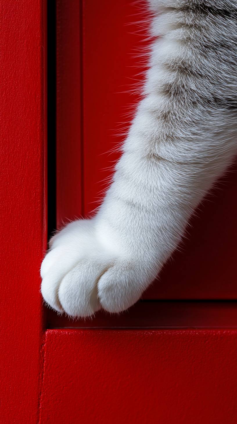 Uma foto de close de uma pata de gato arranhando a borda de um batente de porta, com fundo vermelho chinês.