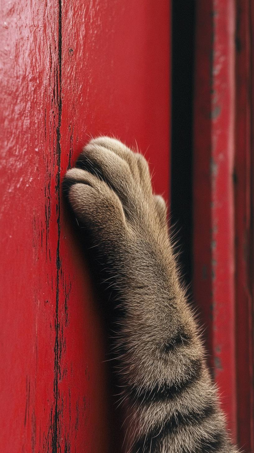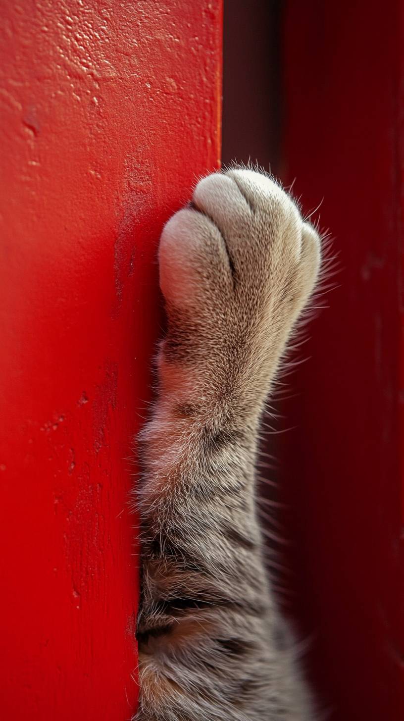 Uma foto hiper-realista vista de trás, apresentando um close-up da pata de um gato arranhando a borda de uma moldura de porta, com um fundo vermelho chinês.
