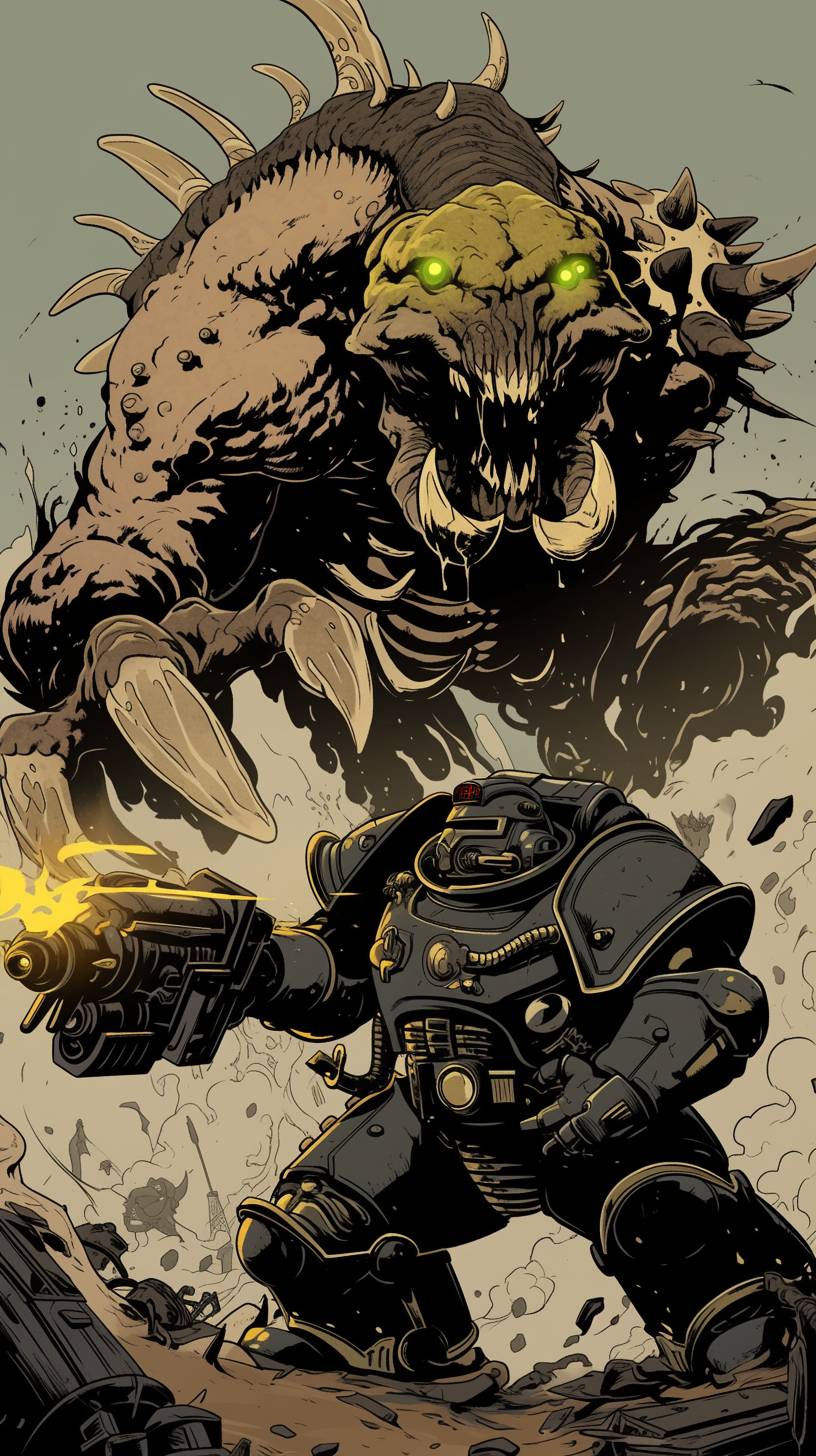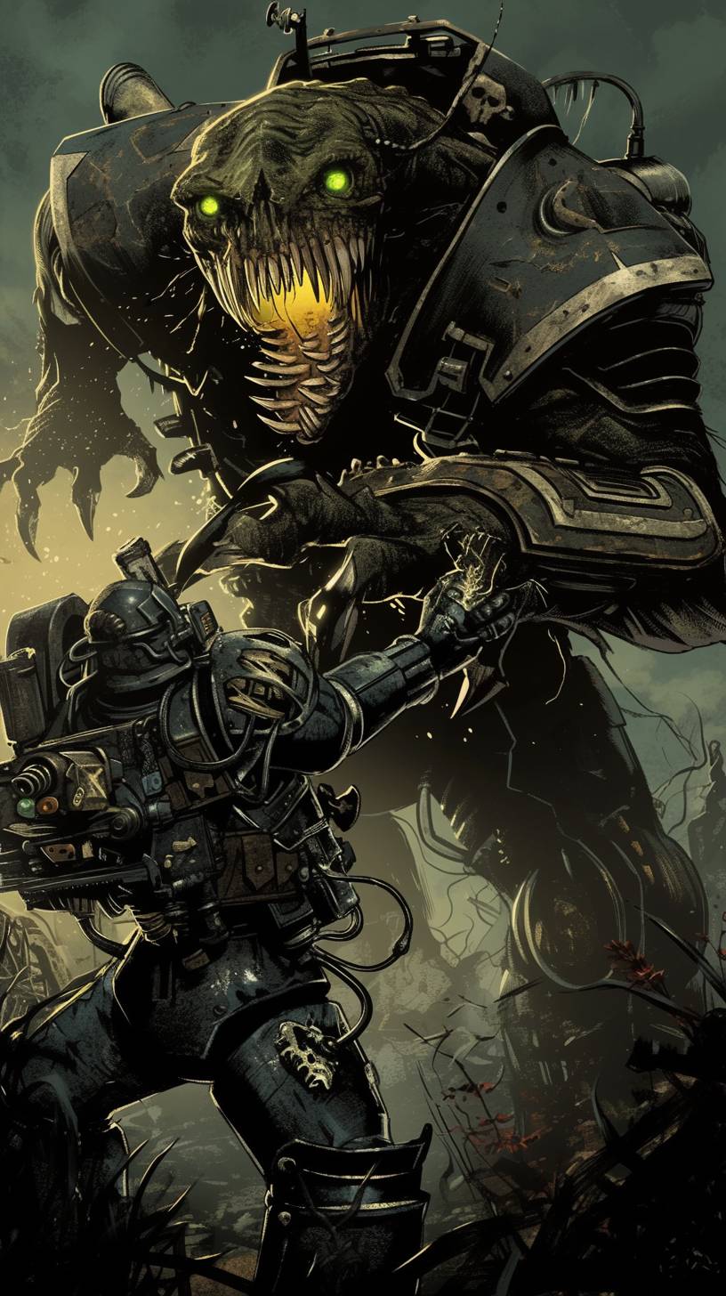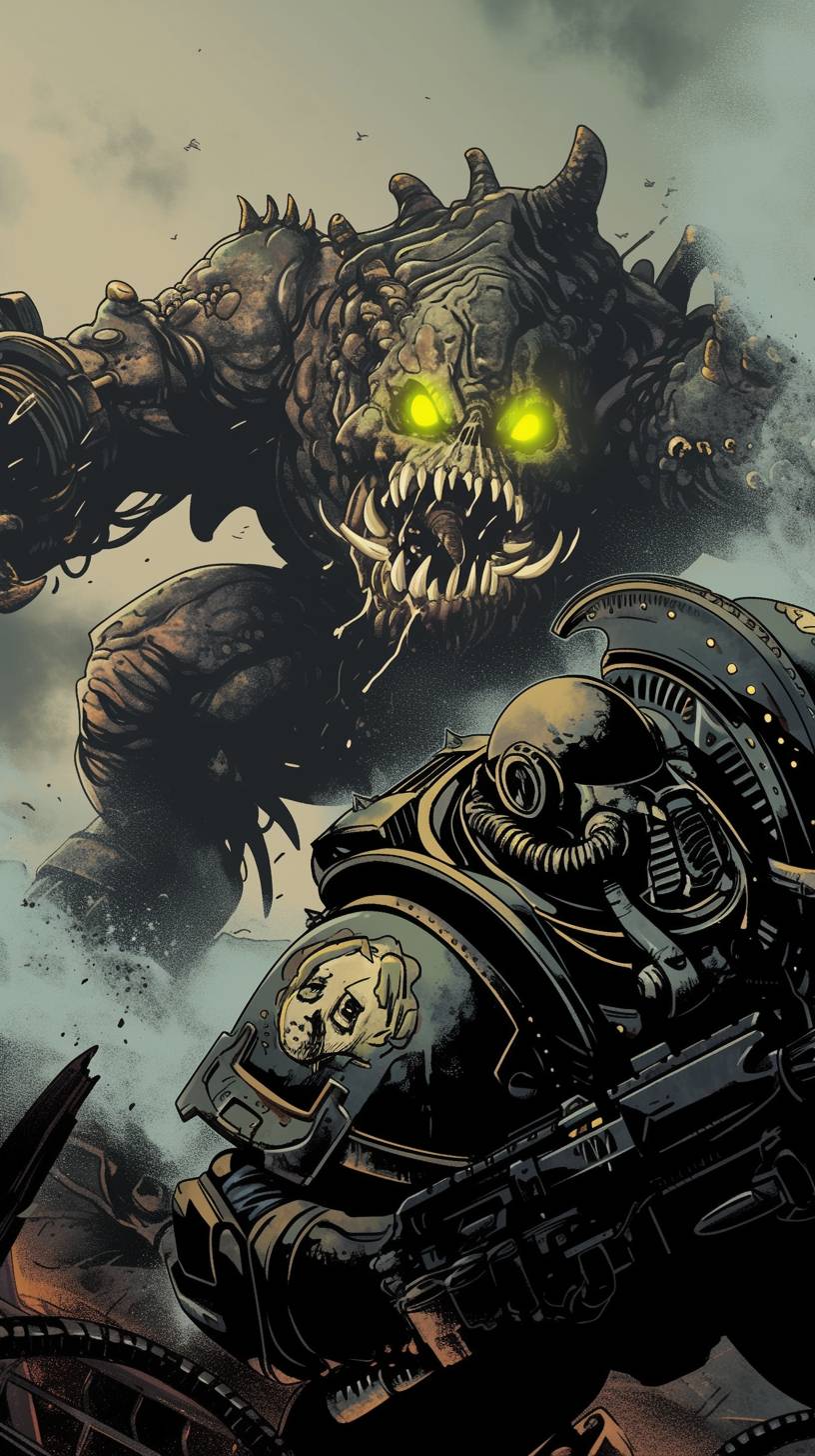 A detailed illustration of Fallout's power armor fighting a huge monster with yellow skin, green eyes and large fangs, in the style of Frank Miller's comic book art with gritty dark lines and deep colors. The background is a foggy wasteland. Use only blue, green, black, yellow and red colors. --ar 9:16 --style raw --niji 6
