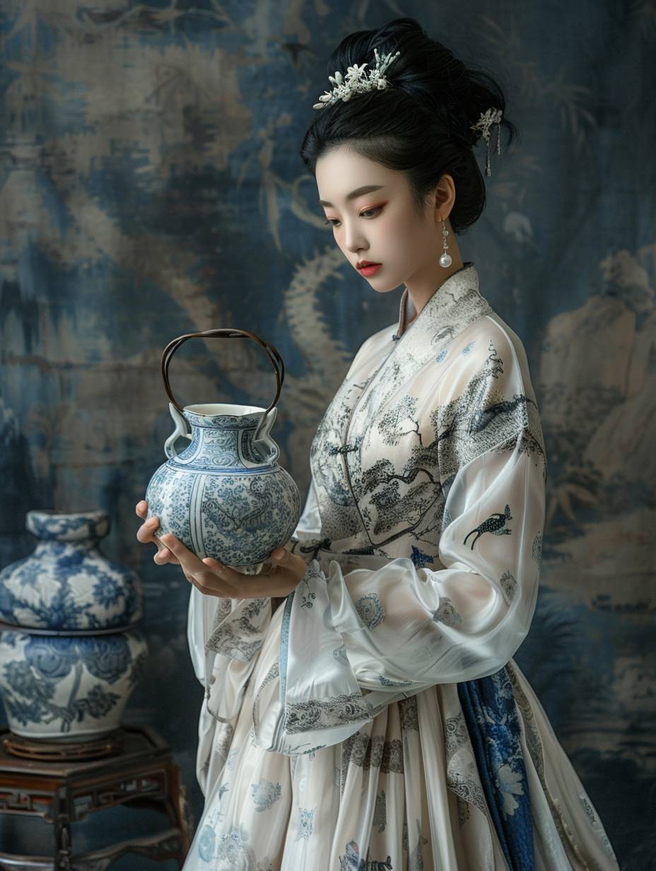 an asian woman in a white and blue dress holding a vase, in the style of large scale paintings, monochromatic elegance, tabletop photography, bo chen, animal motifs --ar 3:4 --v 6.0