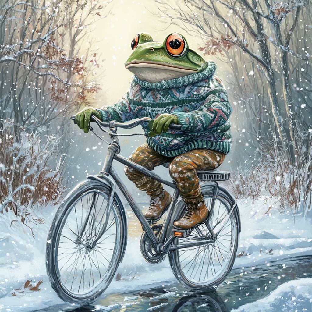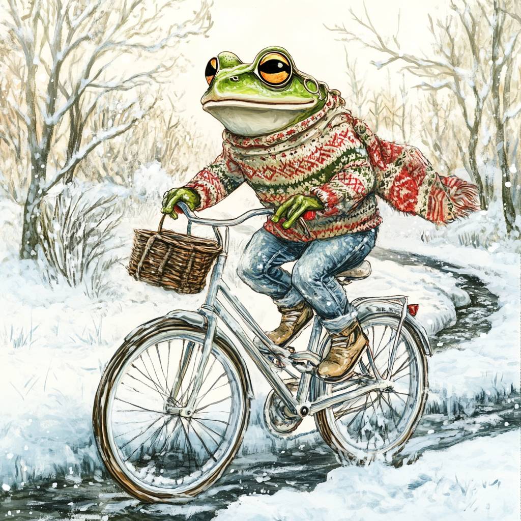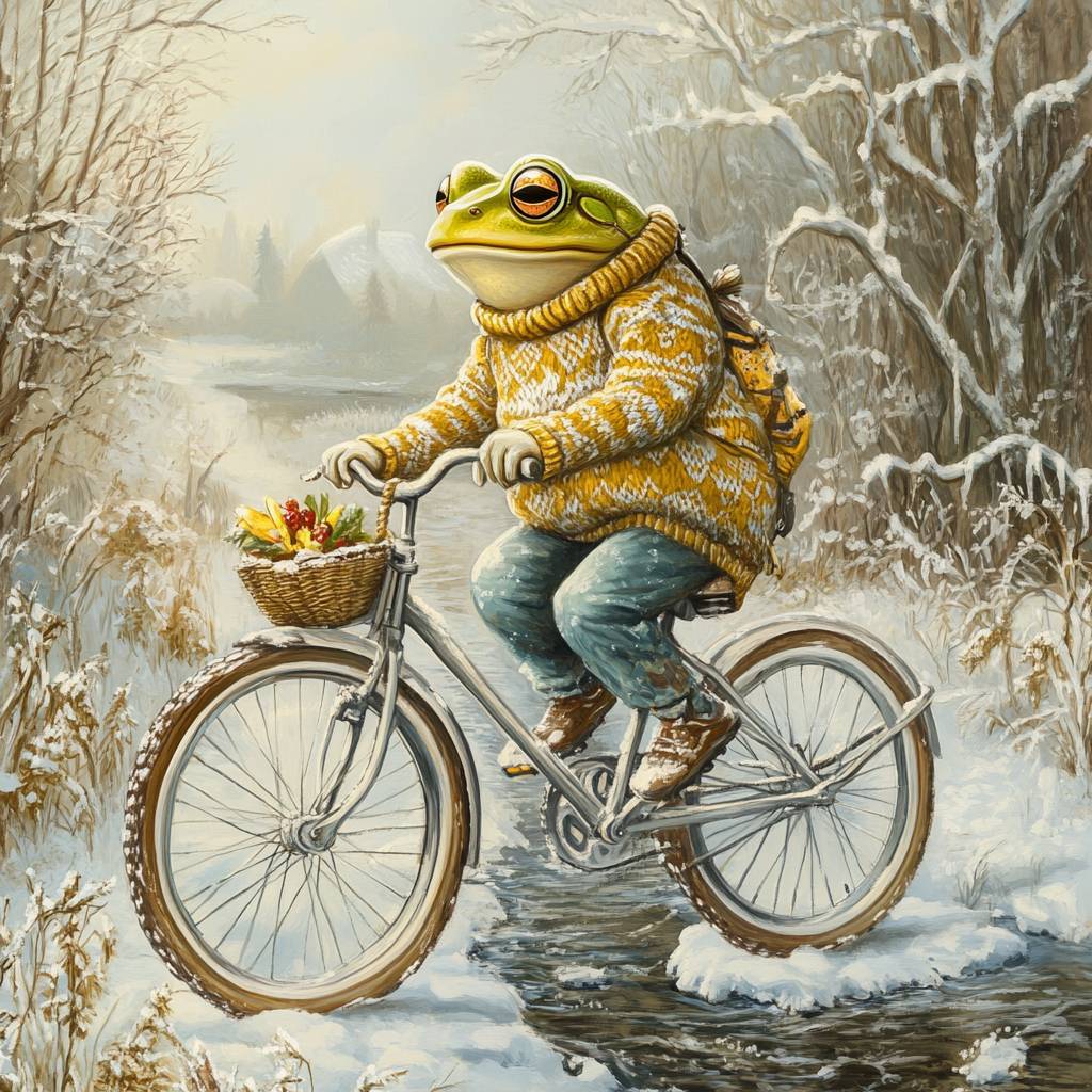 a high detail illustration of a frog wearing nordic sweater riding a bicycle next to a frozen stream --ar 1:1 --v 6.1 --style raw