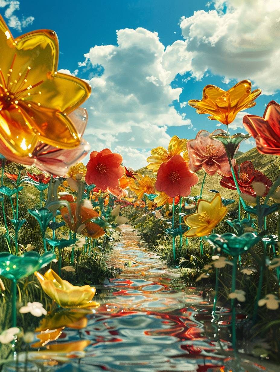 the scene semitransparent inflatable:1.5, Glass texture,huge inflated flowers,vivid color, inflated red petals, inflated yellow stamens, inflated green leaves, inflated blue sky and white clouds, an inflated meadow, a small stream flows nearby, and the inflatable hills are covered with lush pastures. dreamlike high photography, 8K, Photography, Masterpiece, best quality, ultra detail, vivid color,super detail, C4D scenes, studio lighting, realism, octane rendering, 4K, perfect anatomy --ar 3:4 --v 6.0