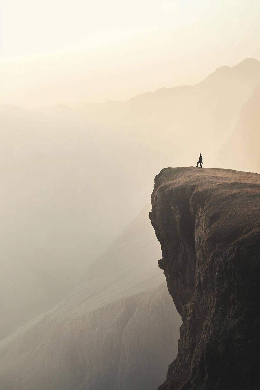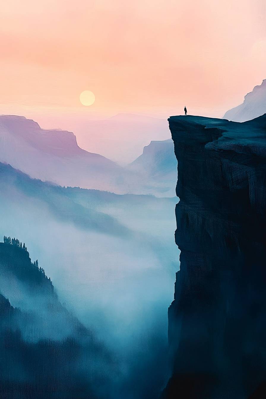 Minimalist mountain range, soft pastel sunrise, cool misty haze, lone figure on a cliff, tranquil scene, muted earth tones, wide landscape, clean lines, peaceful atmosphere --v 6.1 --ar 2:3