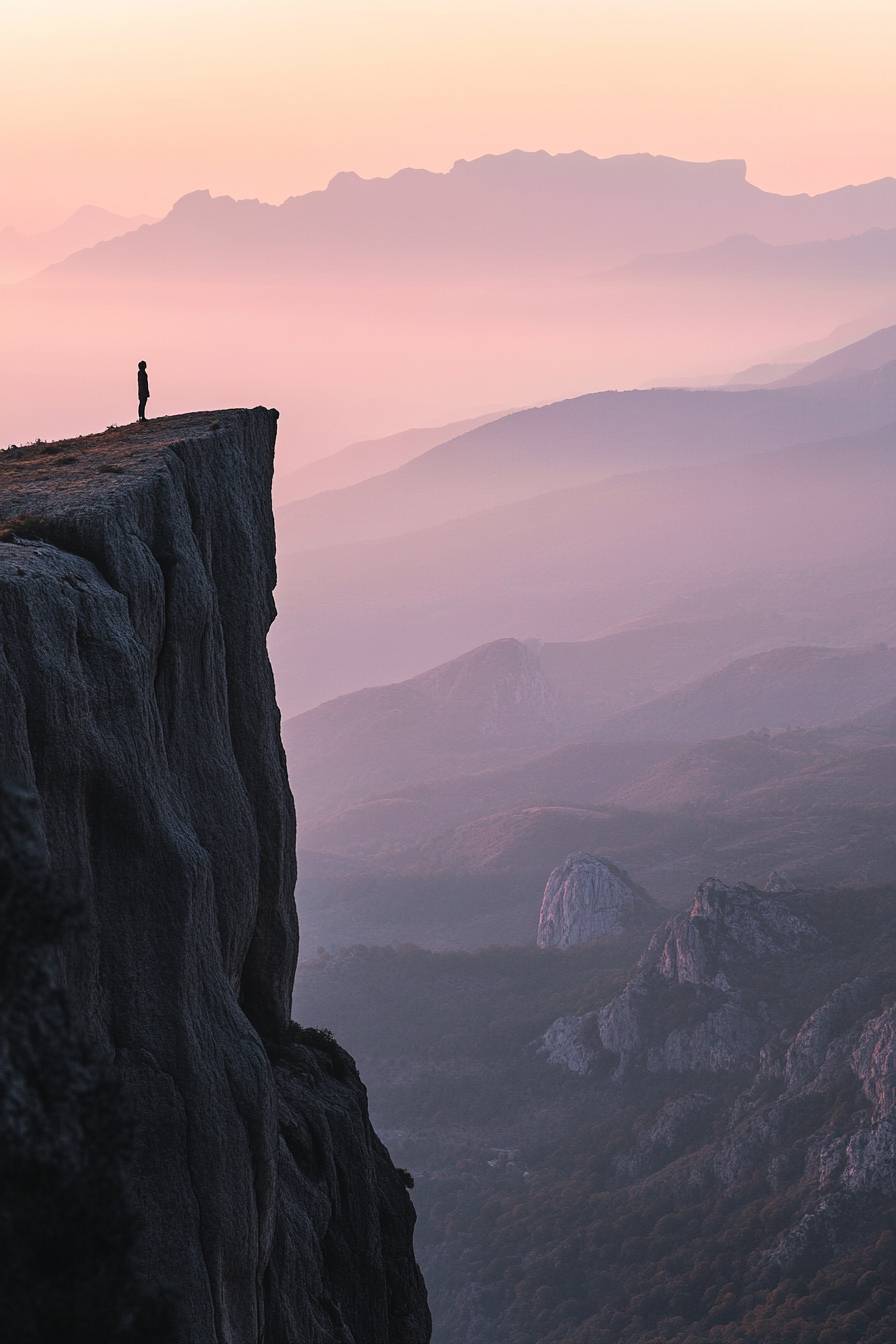 Uma cena tranquila de uma figura solitária em um penhasco com um suave nascer do sol sobre uma cadeia de montanhas minimalista.
