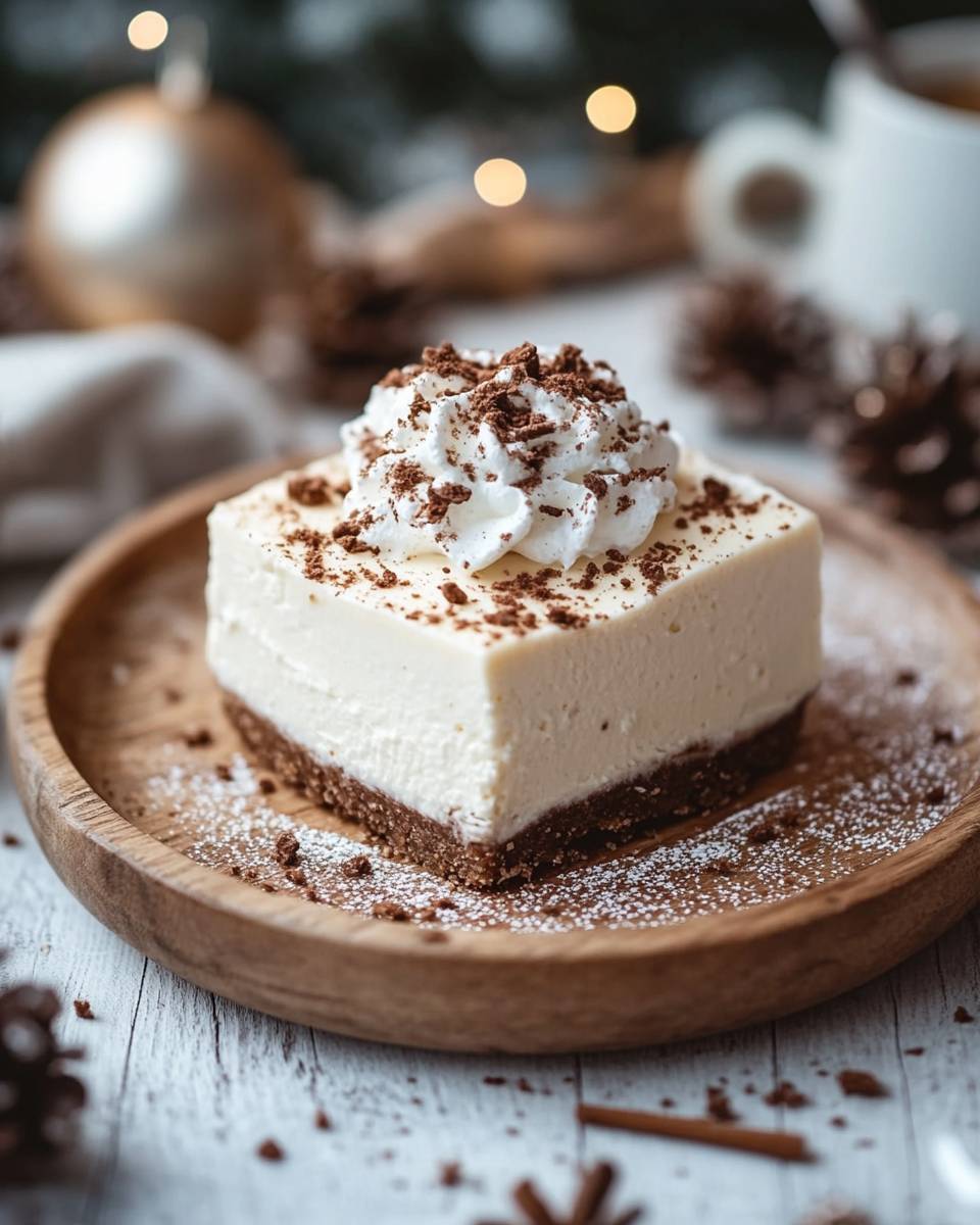 Fotografia de estilismo de comida, vista em close-up macro de uma sobremesa em uma mesa de madeira, decoração boho, cores bege com decorações de Natal boho.