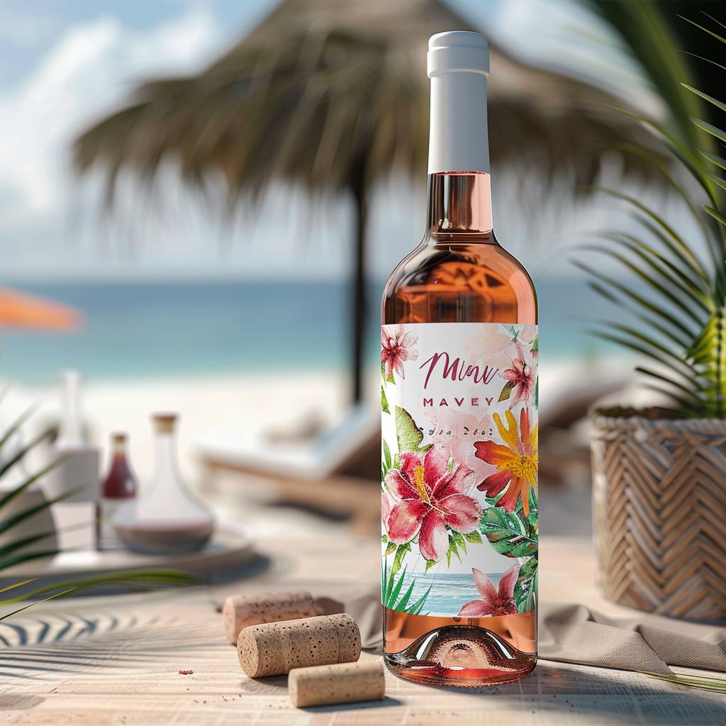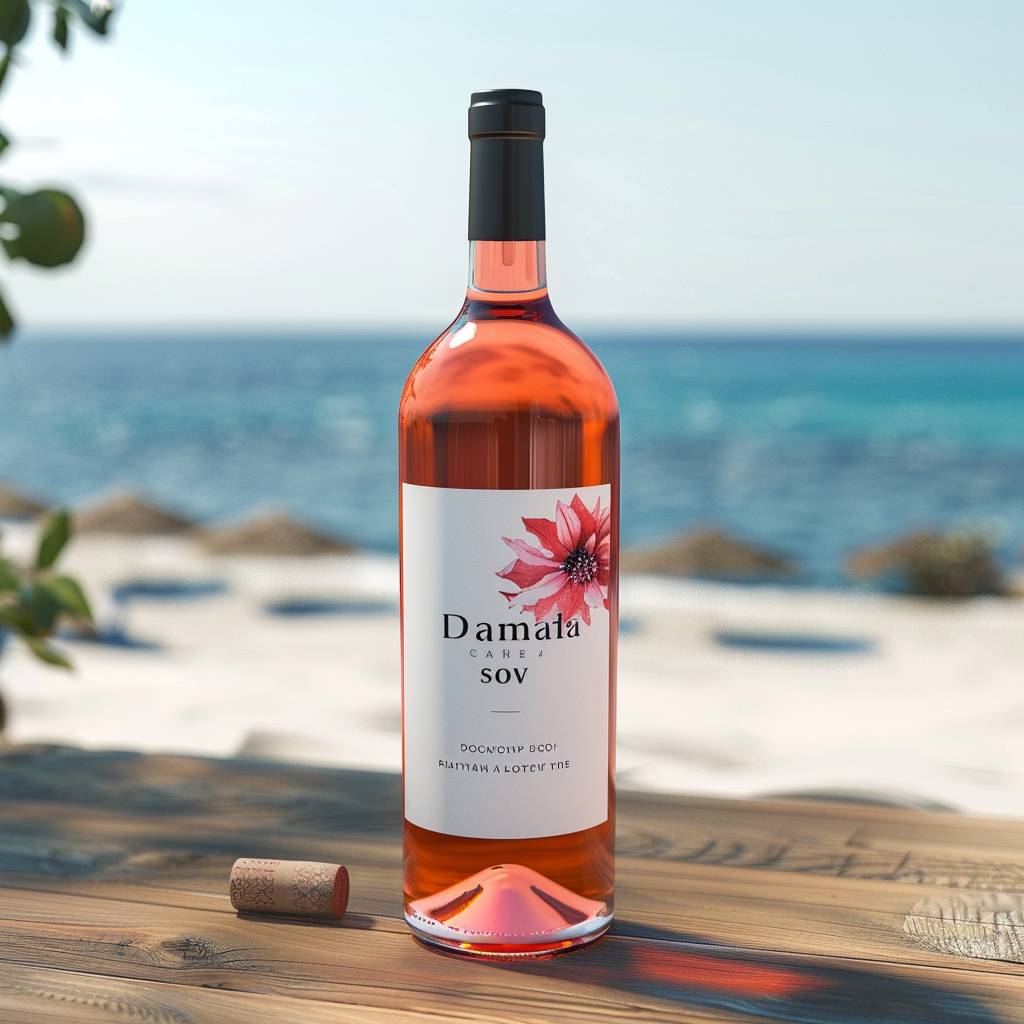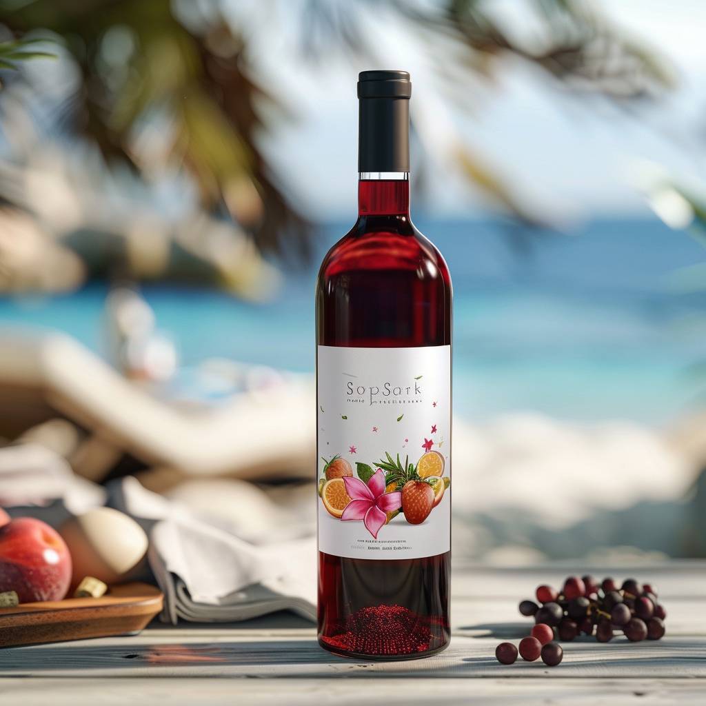 Mockup de rótulo de garrafa de vinho sangria em uma mesa de praia ensolarada.