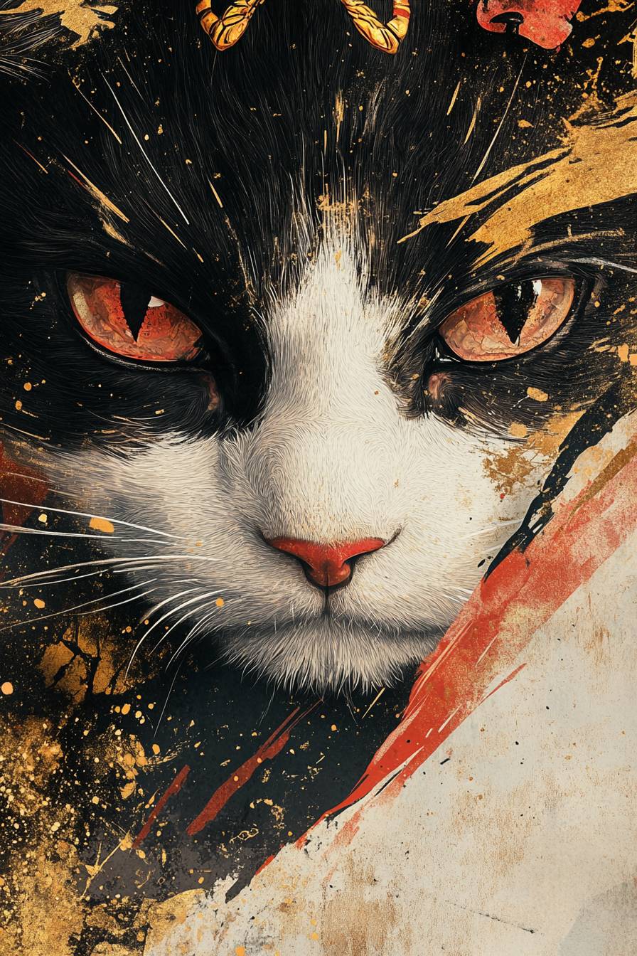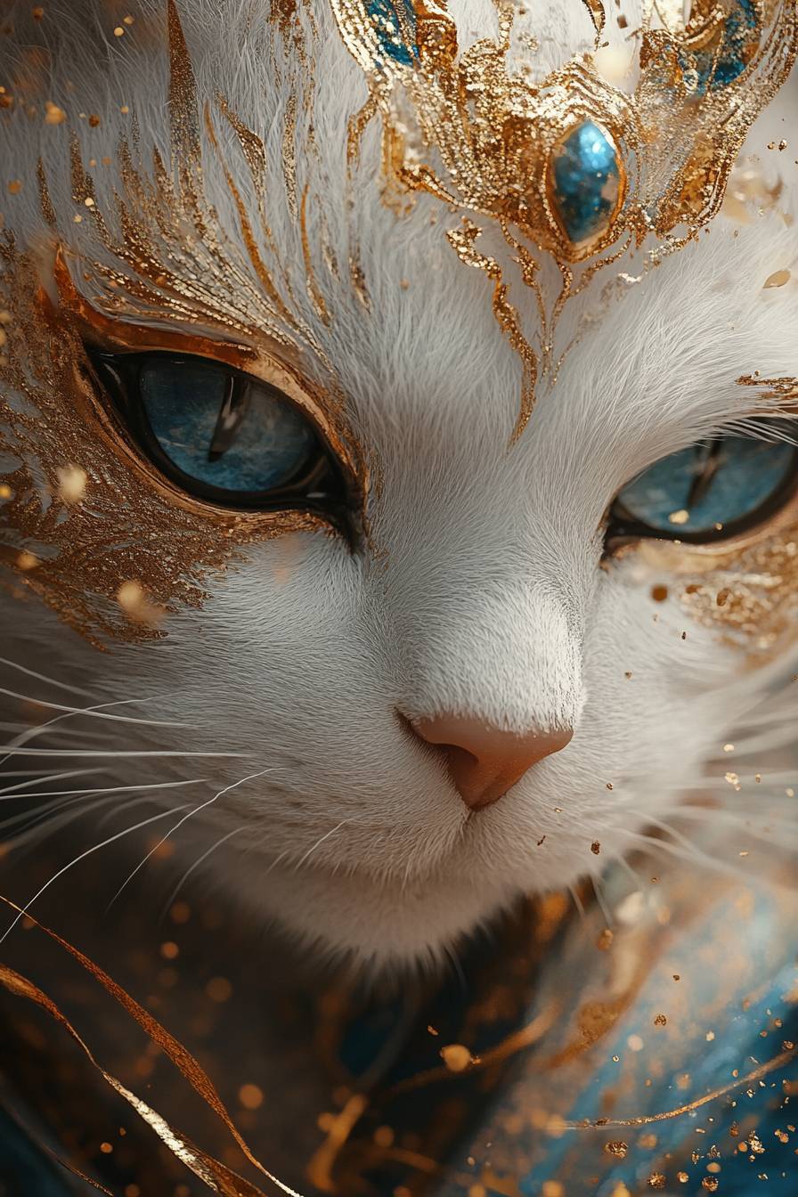 Illustration in the style of Makoto Muramatsu, featuring a close-up of a cute, adorable cat's face. The cat's face is adorned with an artistic interpretation of a Peking Opera mask, and it is dressed in traditional male opera attire. The background features a large area of negative space with splashes of gold powder, texture brushes, and a depth of field effect. The art style is soft and beautiful, with rich details and a mysterious atmosphere, while the foreground and background are blurred, creating a dreamy and hazy effect. --ar 2:3 --v 6.1 --s 250
