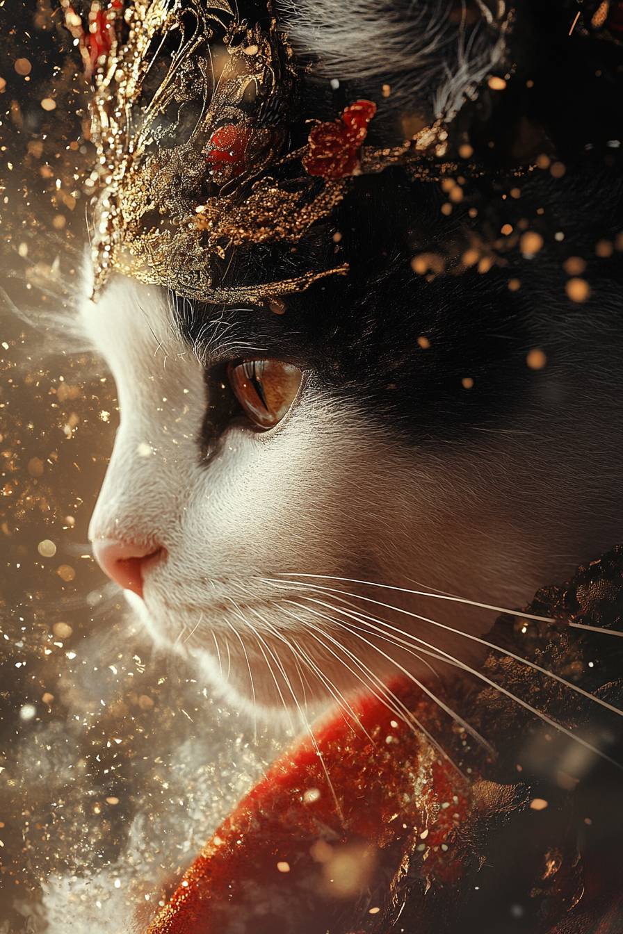 Uma ilustração no estilo de Makoto Muramatsu, apresentando um close-up de um rosto de gato fofo e adorável. O rosto do gato é adornado com uma interpretação artística de uma máscara de ópera de Pequim, e está vestido com roupas tradicionais de ópera masculina. O fundo apresenta uma grande área de espaço negativo com respingos de pó dourado, pincéis de textura e um efeito de profundidade de campo. O estilo artístico é suave e bonito, com ricos detalhes e uma atmosfera misteriosa, enquanto o primeiro plano e o fundo estão desfocados, criando um efeito sonhador e nebuloso.