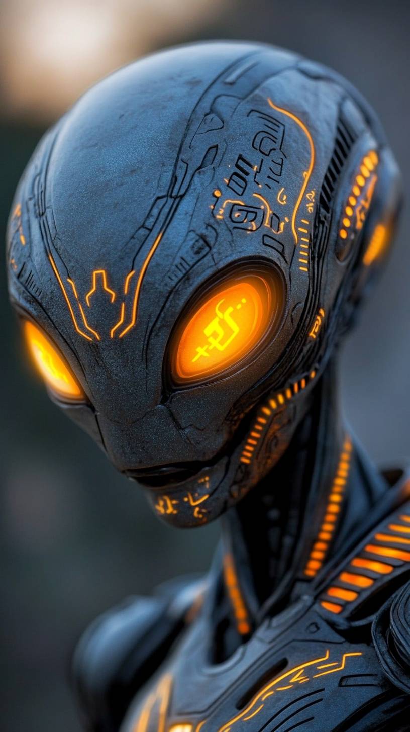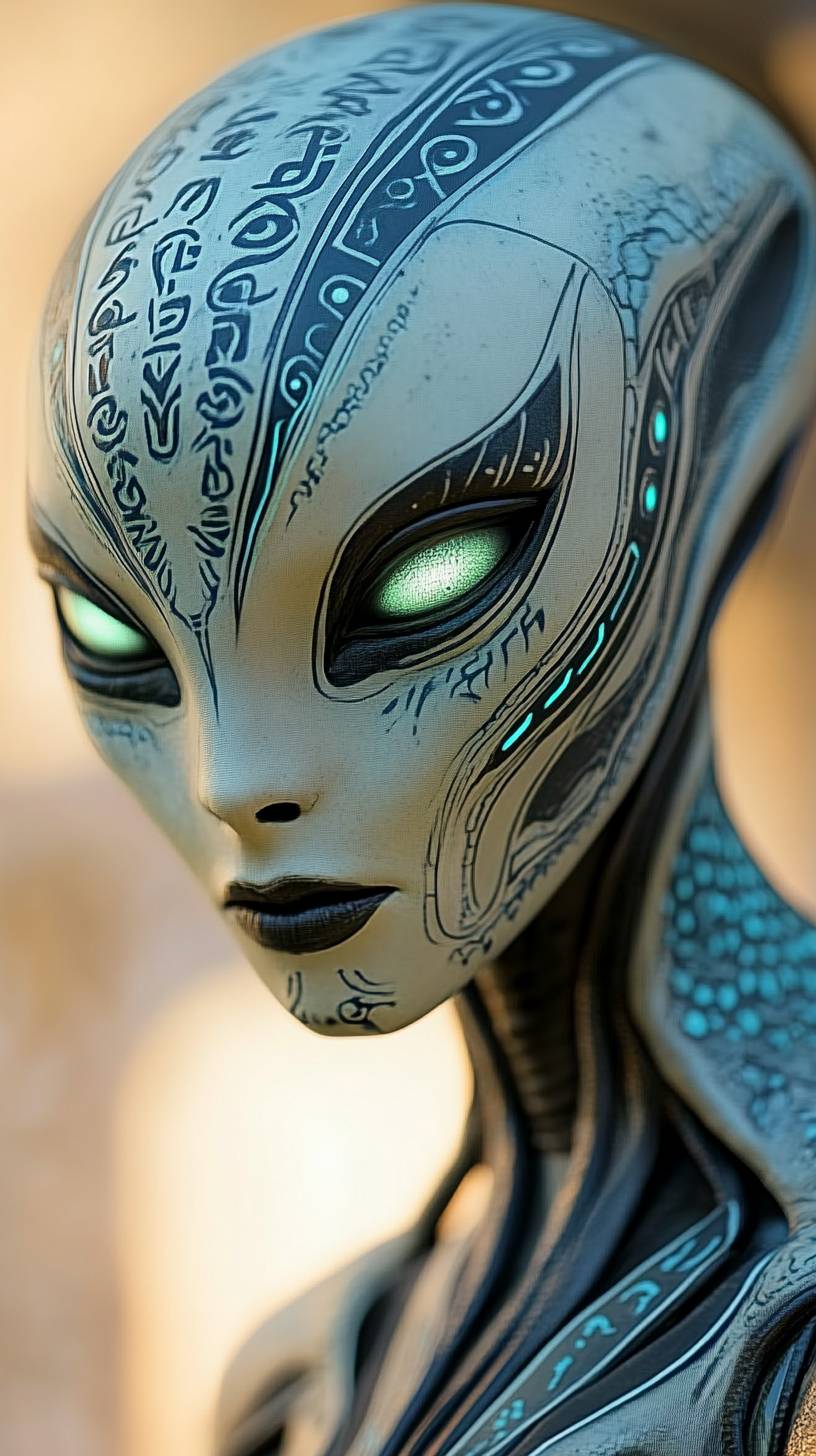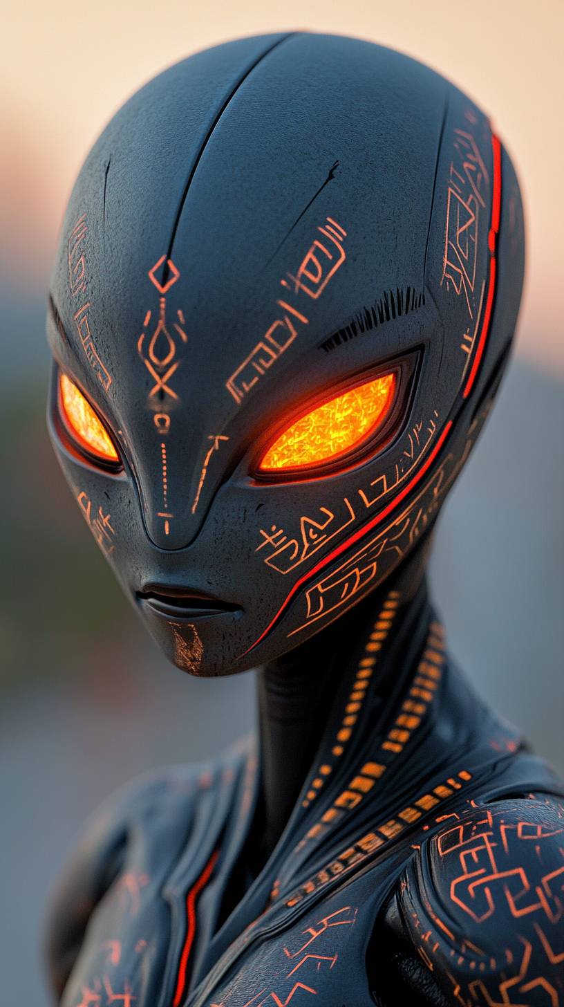 Um alienígena com tatuagens hieroglíficas brilhantes, ameaçador, brilhante e polido.
