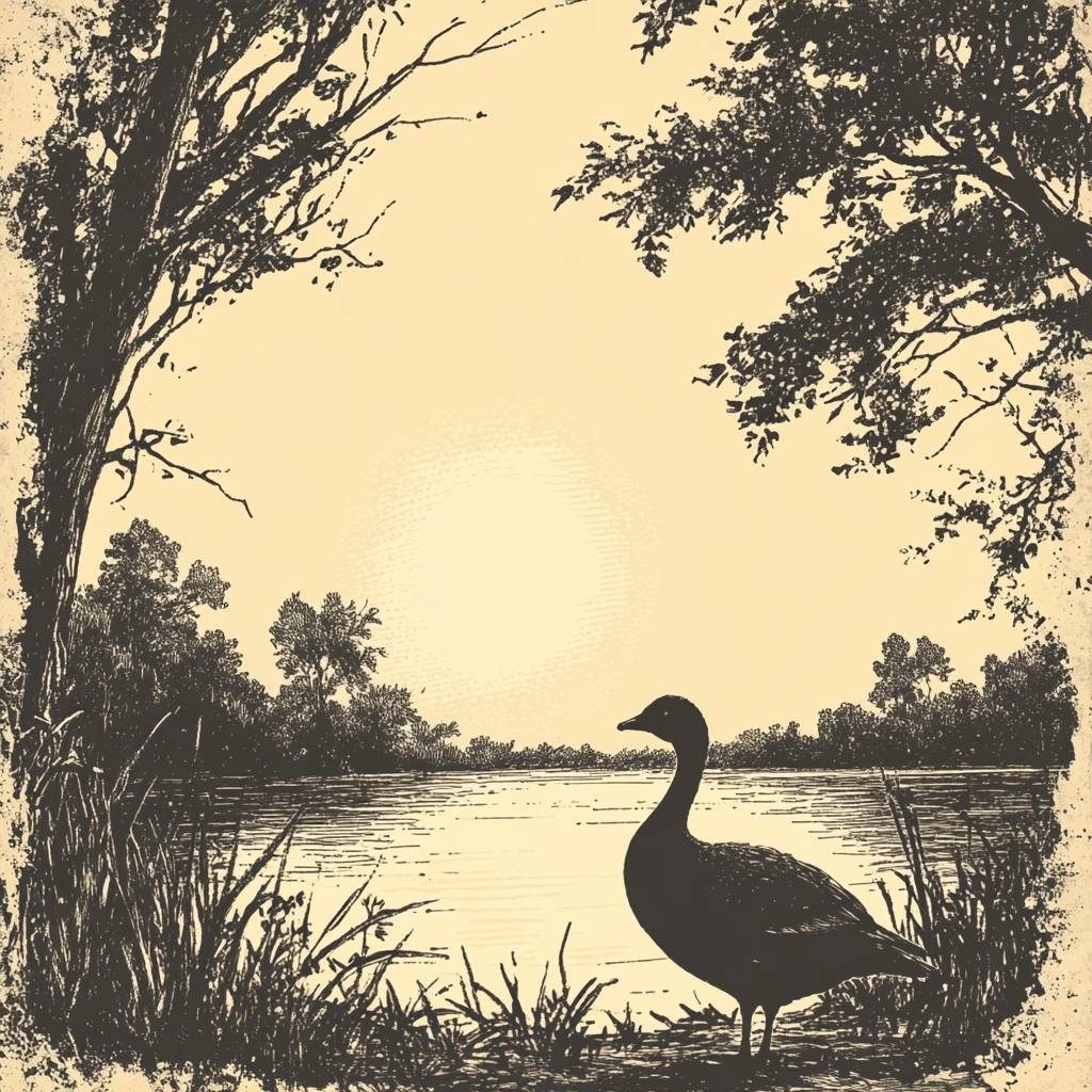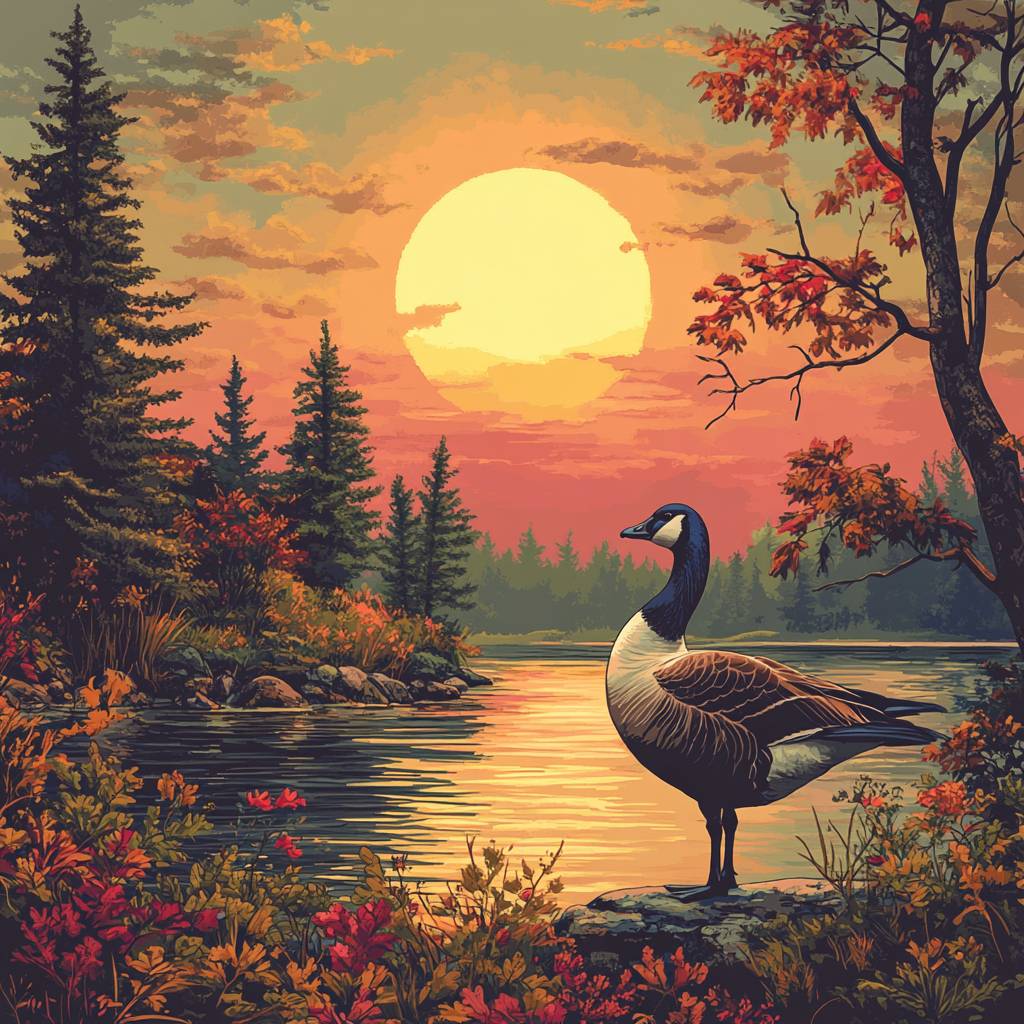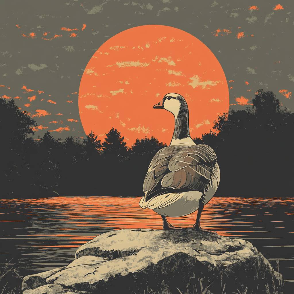 Uma ganso pondera e observa o pôr do sol em um palco à beira do lago.