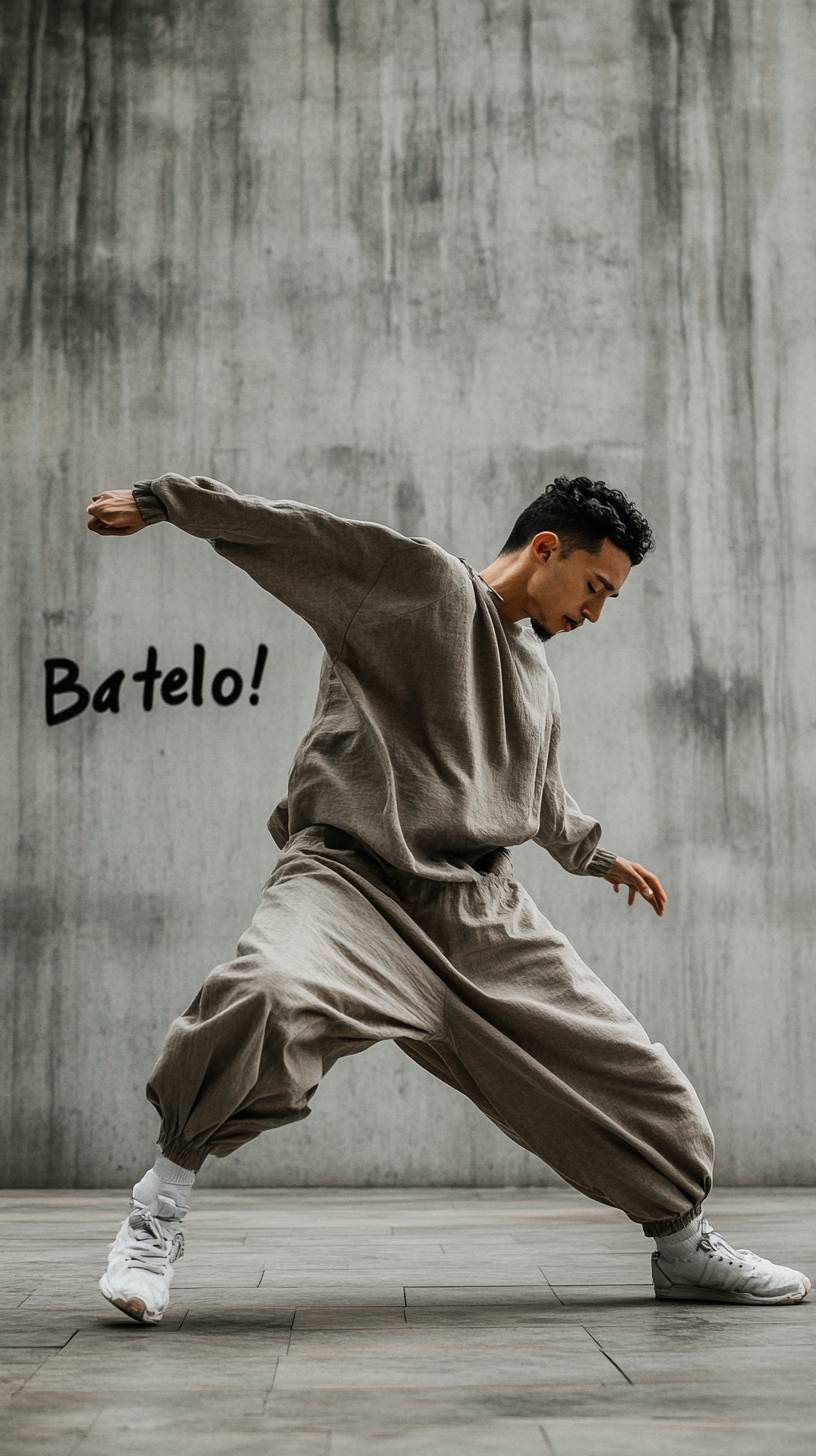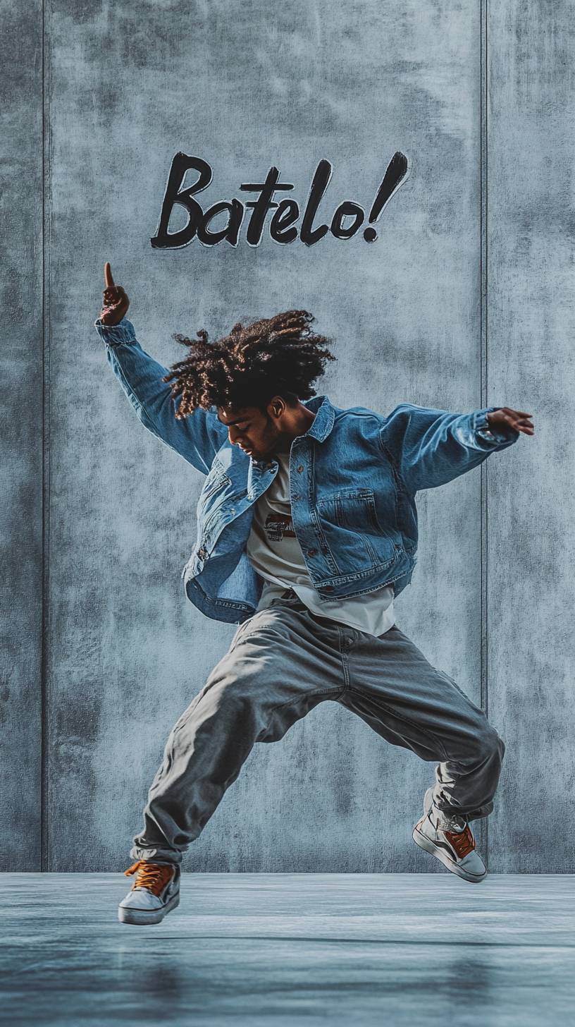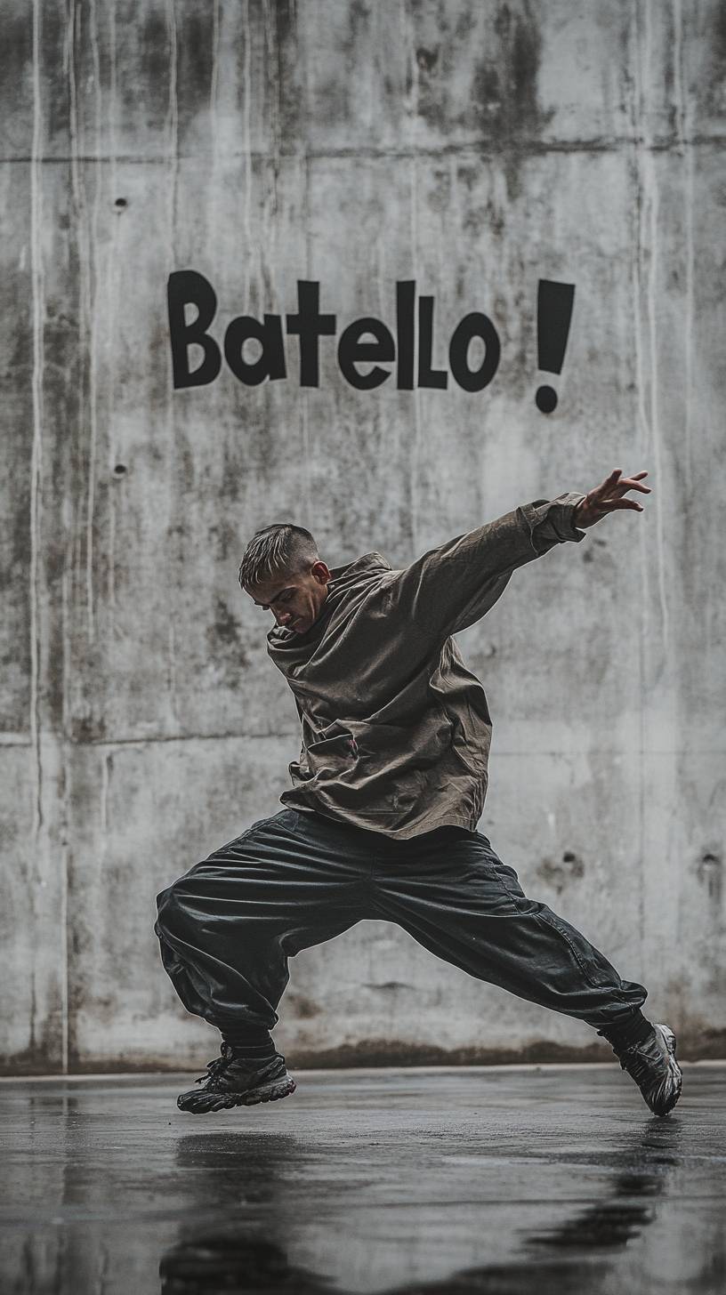 Um dançarino de rua capturado em movimento, usando uma camisa de manga longa oversized e calças largas, com um fundo de parede de concreto minimalista com a inscrição 'Batelo!'.