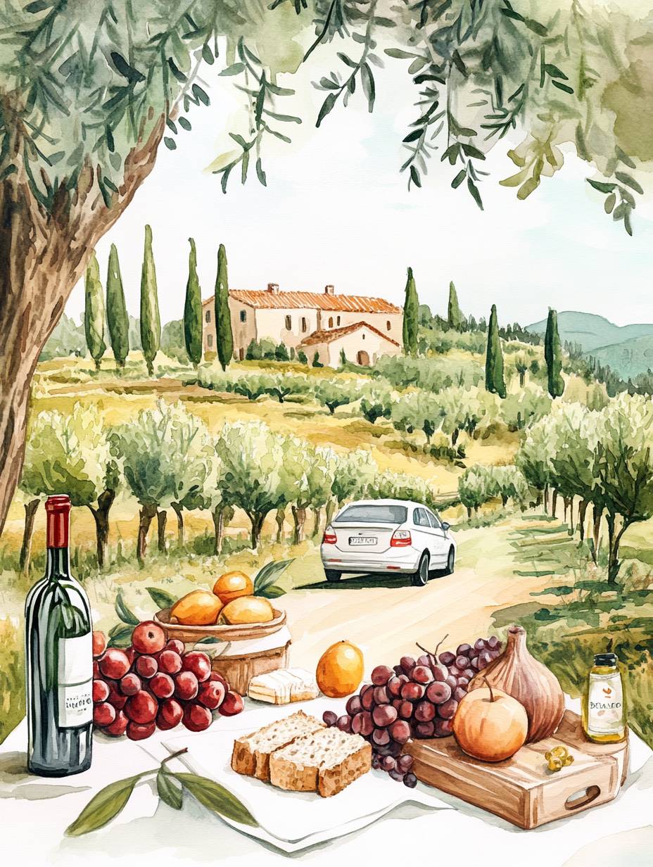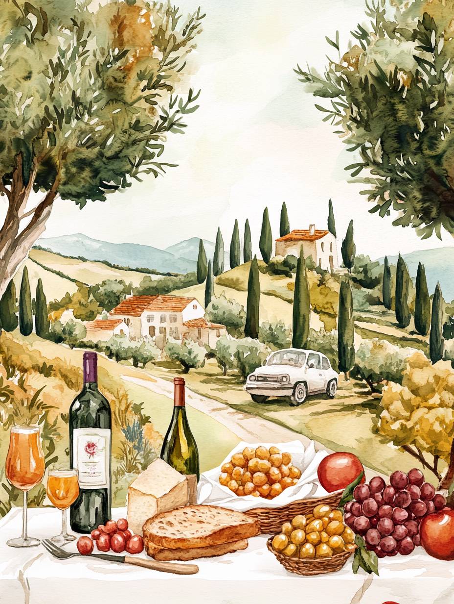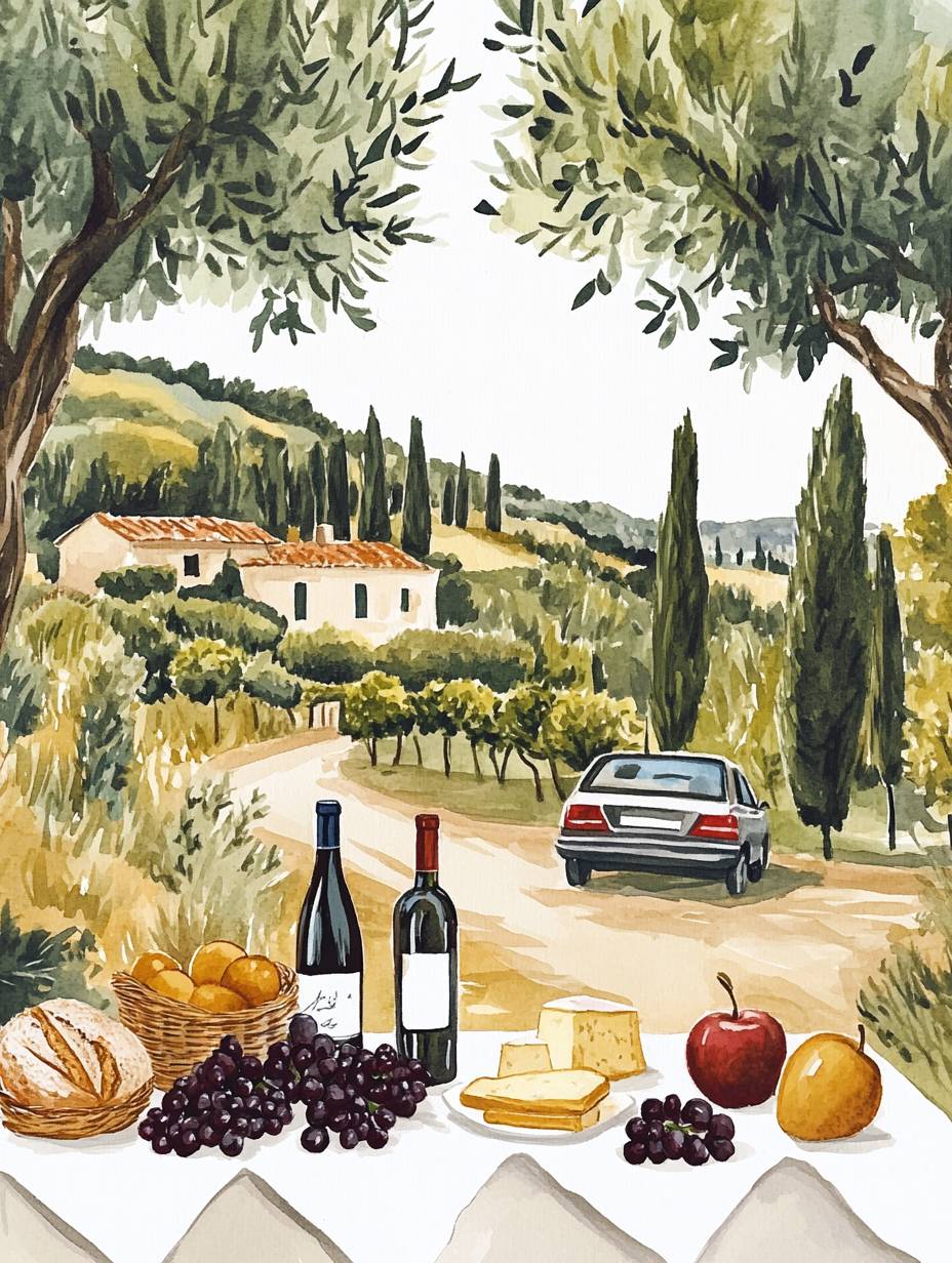 Illustration of the French countryside with a table set for lunch, surrounded by olive trees and distant small houses. In front is an illustration of fruits on white paper, next to it are wine bottles, and next to them there is bread and cheese. Behind all these items stands a car parked under an apple tree. The background features a light gray sky and green cypress trees. Watercolor technique. --ar 46:61 --v 6.1