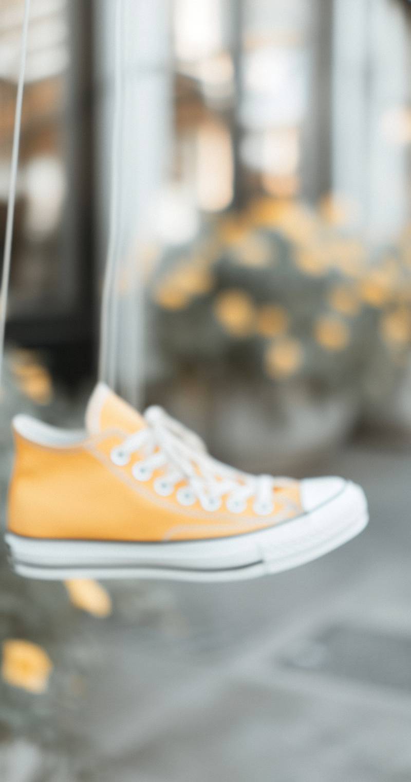 Ténis Converse amarelos pendurados entre flores amarelas com uma rua da cidade ao fundo.