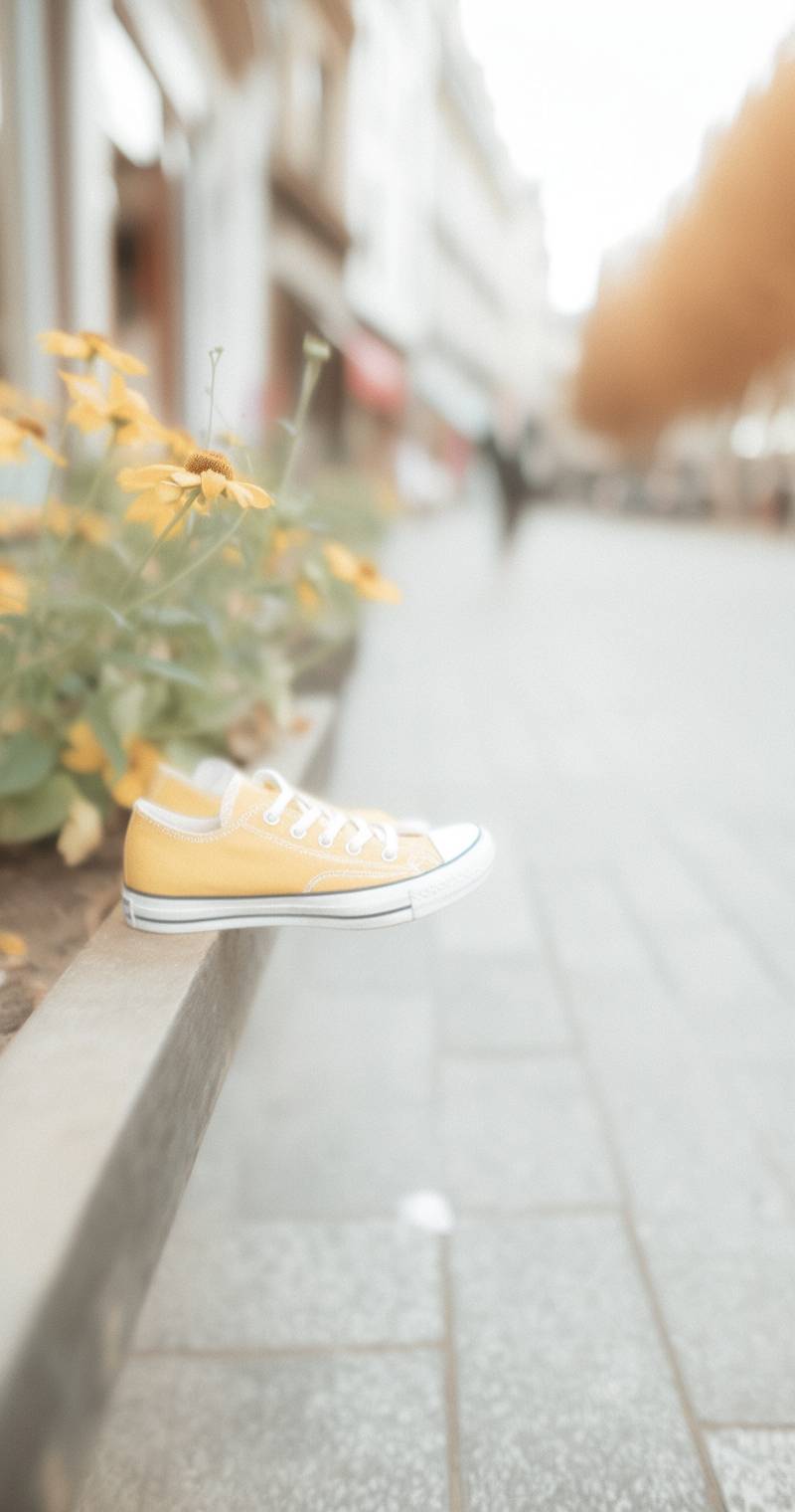 Medium shot of yellow converse sneakers hanging on wires among yellow flowers, shot from a low angle, city street in the background with soft focus, the scene is enveloped in a nostalgic and warm atmosphere, shot on a cloudy day with soft lighting with a Canon EOS-1D X Mark III, 50mm f/1.4 lens, teal and orange bright colors with a slight vintage filter --ar 283:540 --stylize 950 --weird 2500 --niji 6 --style raw
