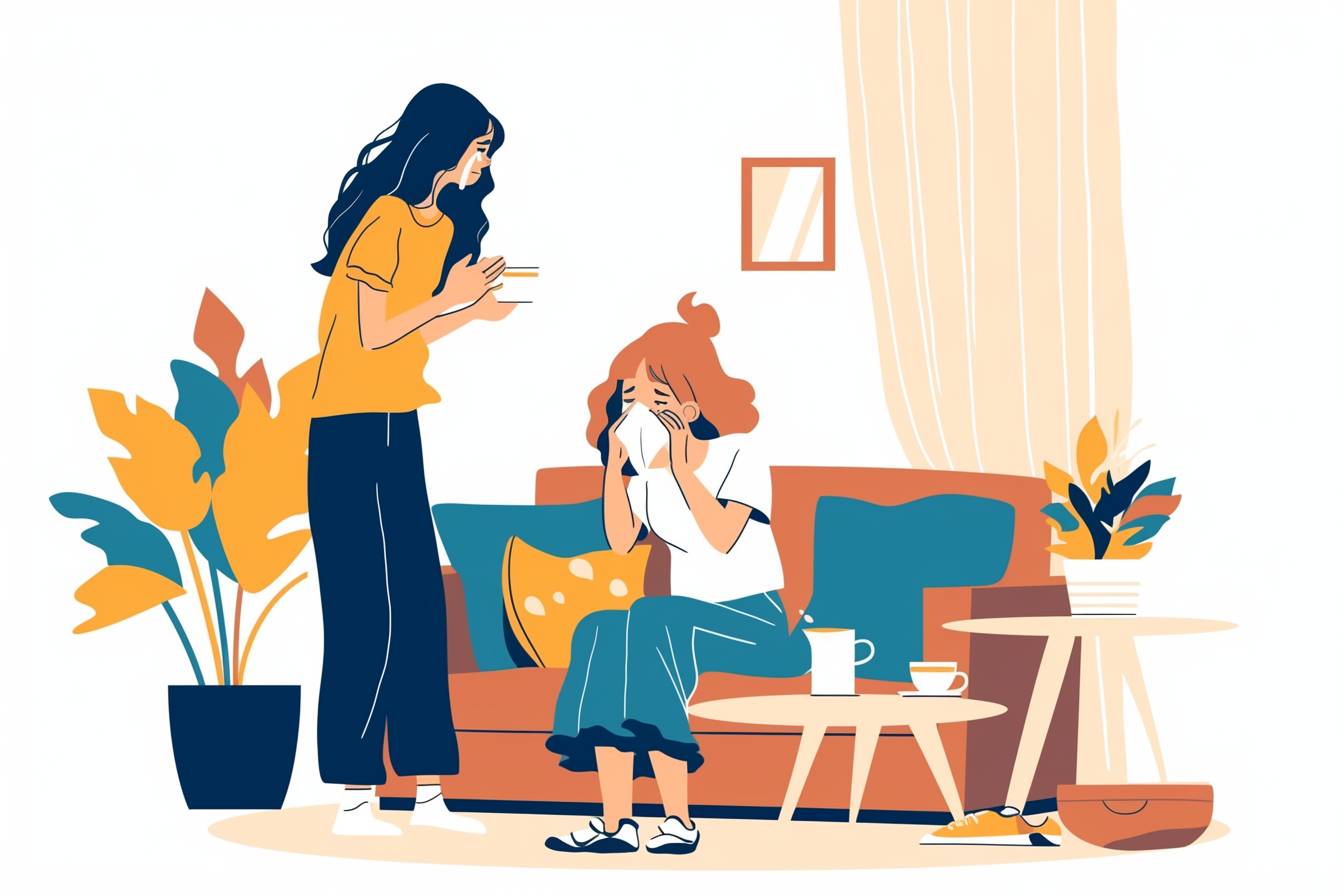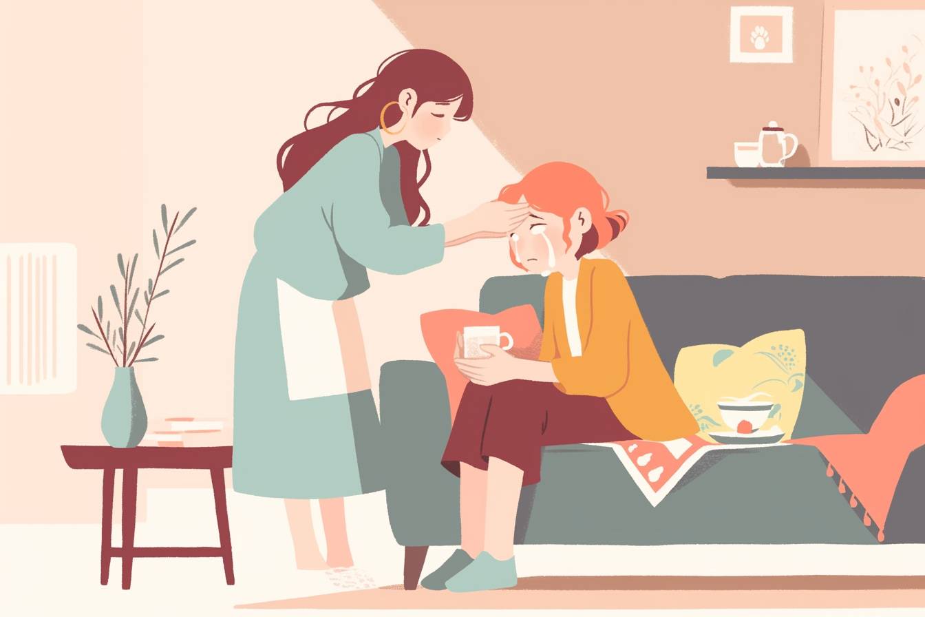 one girl is sitting on the couch and crying, her friend is standing next to her, holding tea and a handkerchief in her hands. Minimalism, cartoon --ar 3:2 --niji 6 --style raw