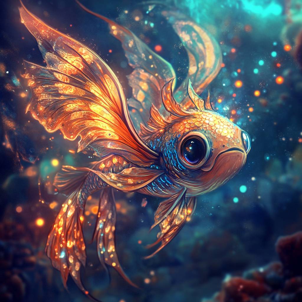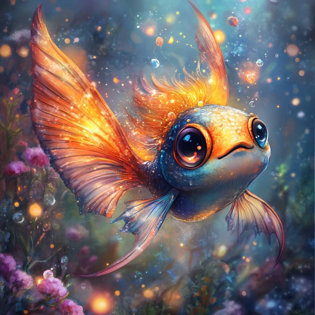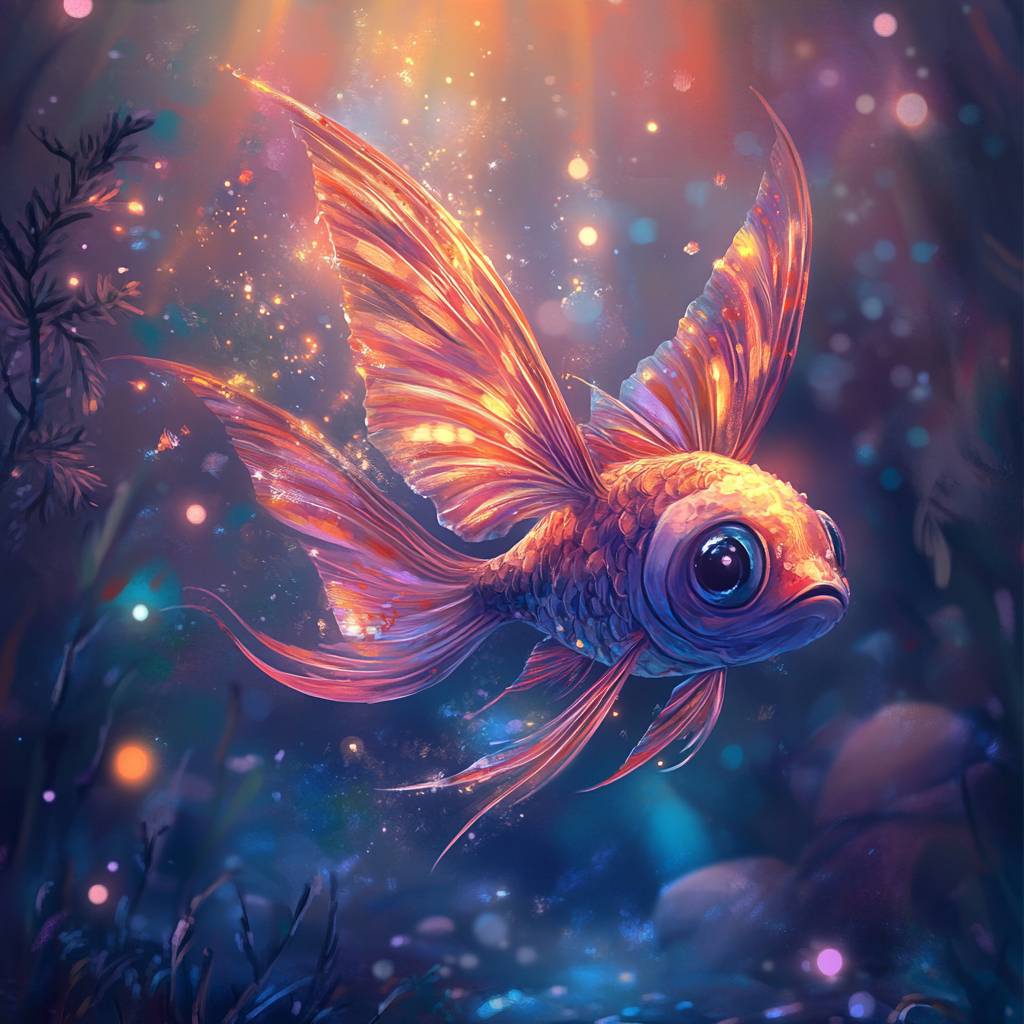 Uma bela criatura de fantasia, um peixe com asas e um fundo brilhante, rico em detalhes de estilo cartoon.
