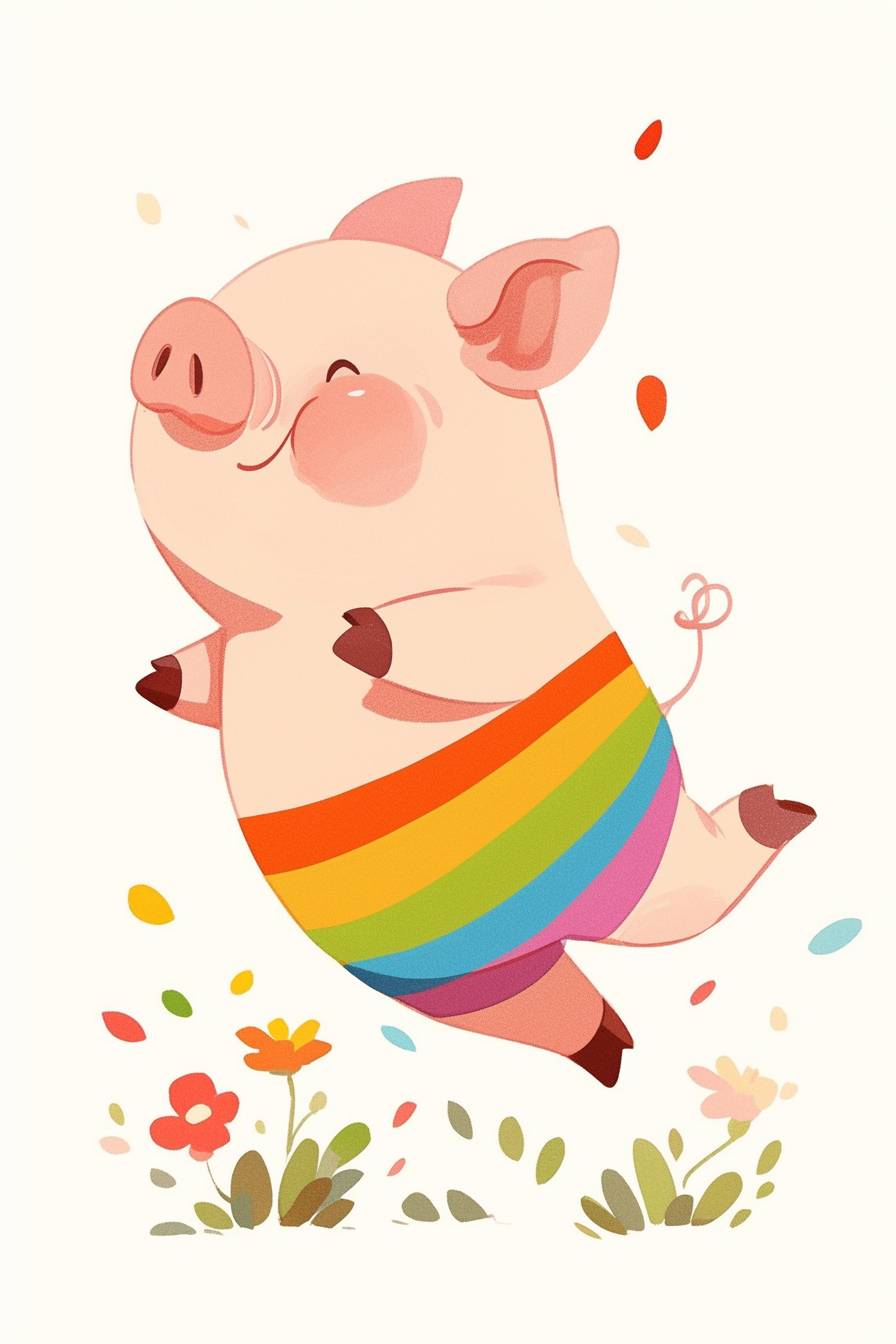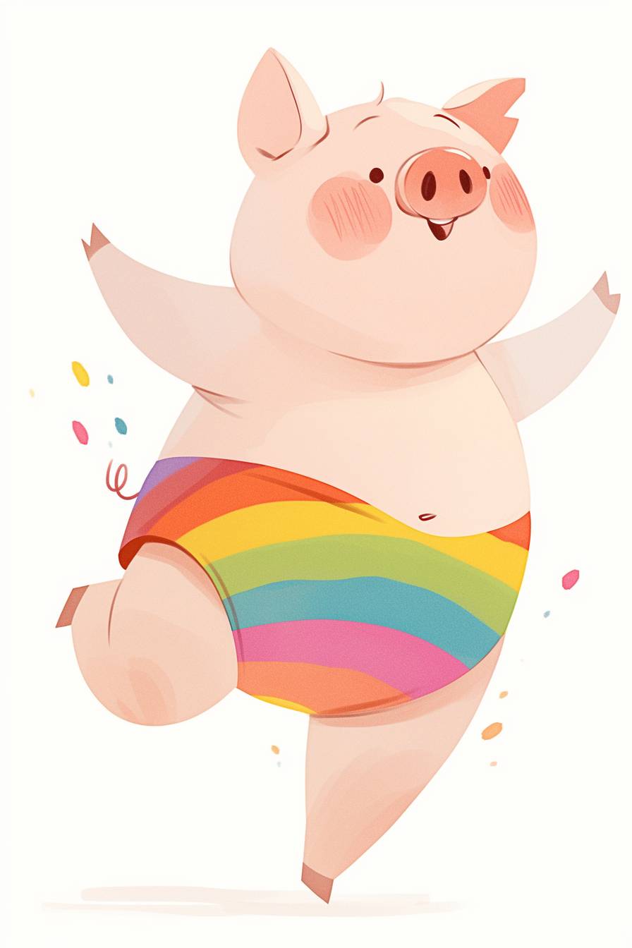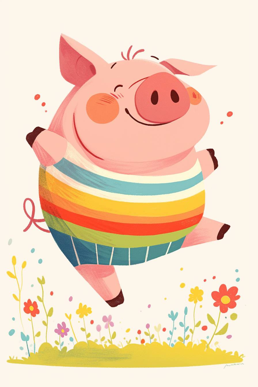 A cute pig wearing colorful, rainbow-striped pants is running in a cartoon style, with a simple drawing on a white background. It is a flat illustration, suitable for a children's book story, with bright colors, simple lines and shapes, and a minimalist style. The little, fat, pink tail of the happy, chubby boar is visible on its back. It stands upright in front with its legs raised high as it runs happily through flower fields. --ar 2:3 --niji 6