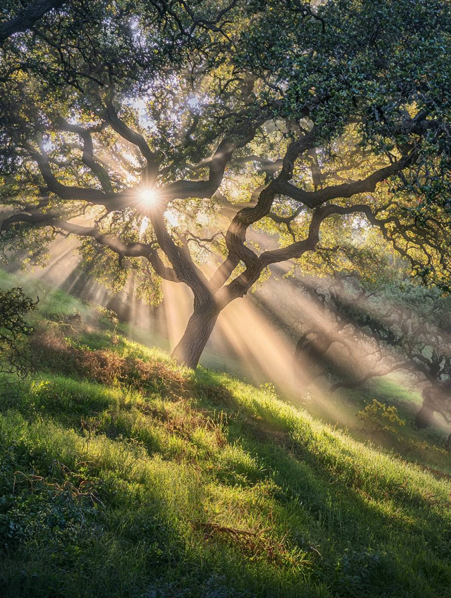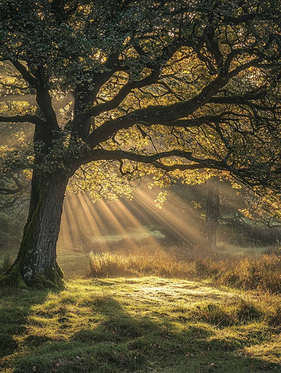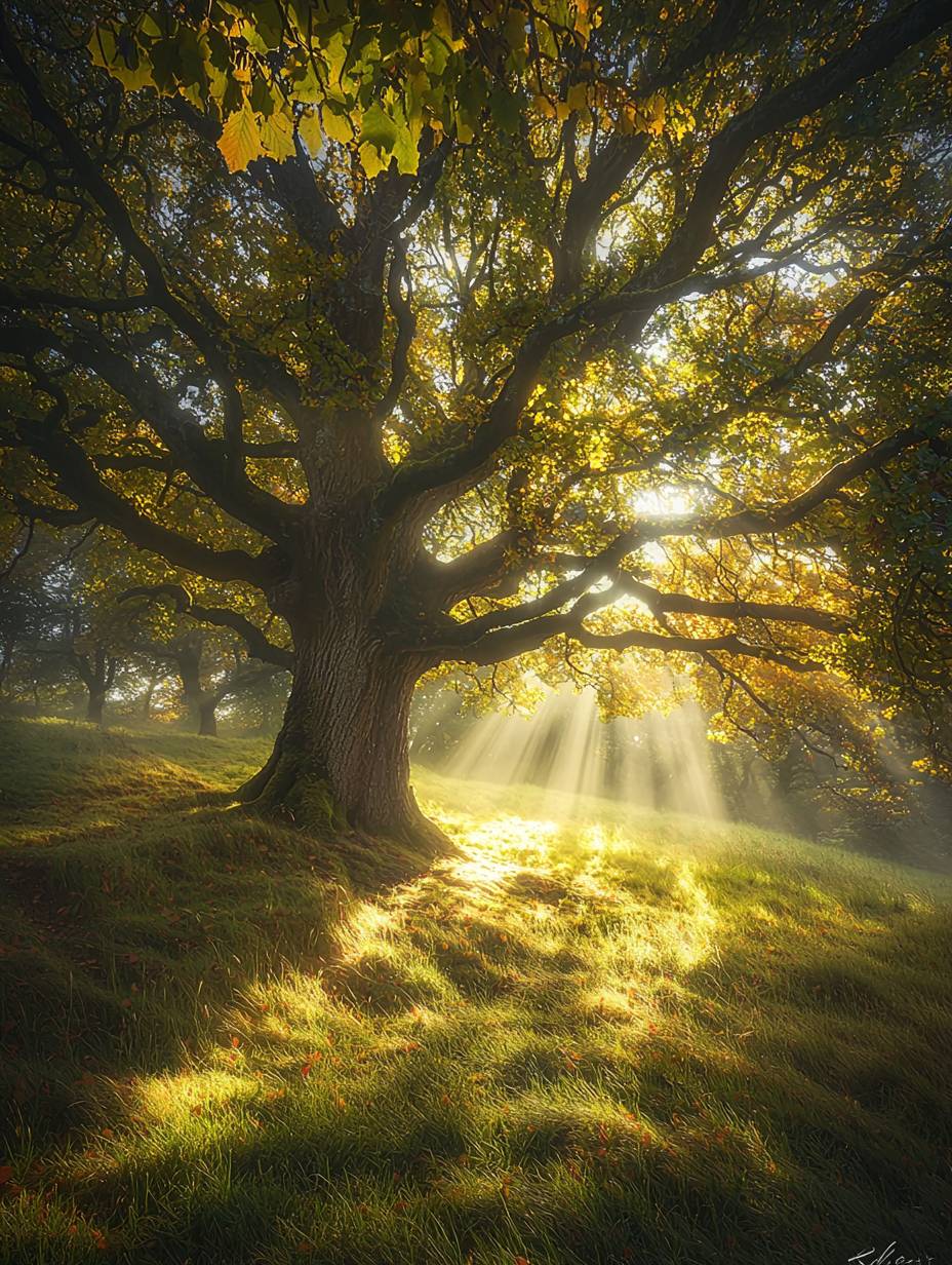 Crepuscular Rays. A sunbeam shines through the leaves of an oak tree in early autumn, creating a misty atmosphere and casting long shadows on the grass-covered ground. The light is soft and warm, with rays gently illuminating the surrounding trees and foliage. This scene captures nature's beauty at its most serene moment, evoking tranquility and natural harmony. --ar 3:4 --v 6.1 --q 2