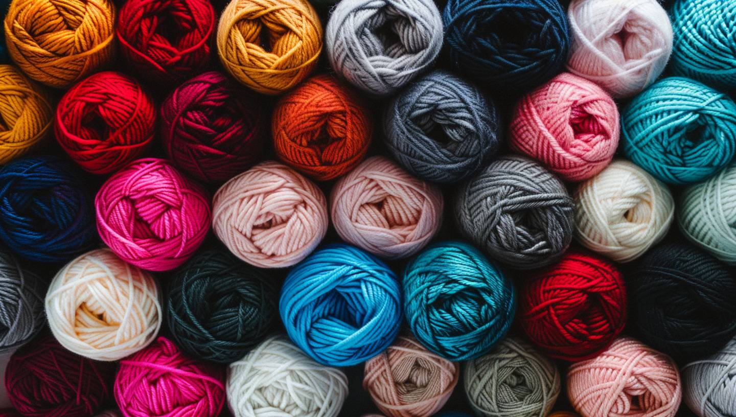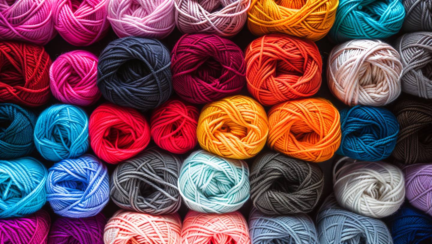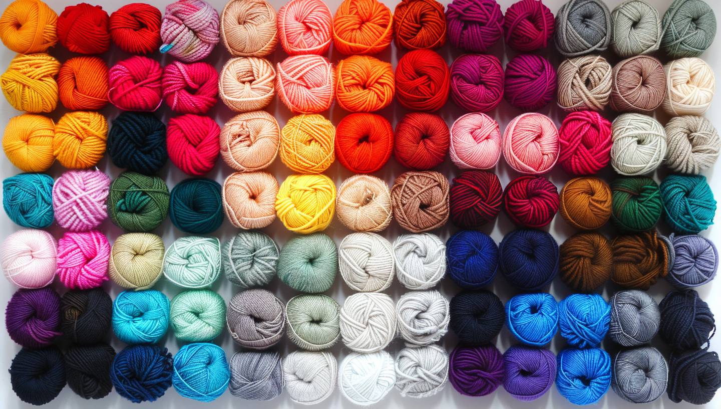Colorful yarn balls arranged in rows, neatly from top to bottom. The colors include reds, pinks, oranges, yellows, blues, greens, grays, white, black, brown. --ar 23:13 --style raw --stylize 50 --v 6.0