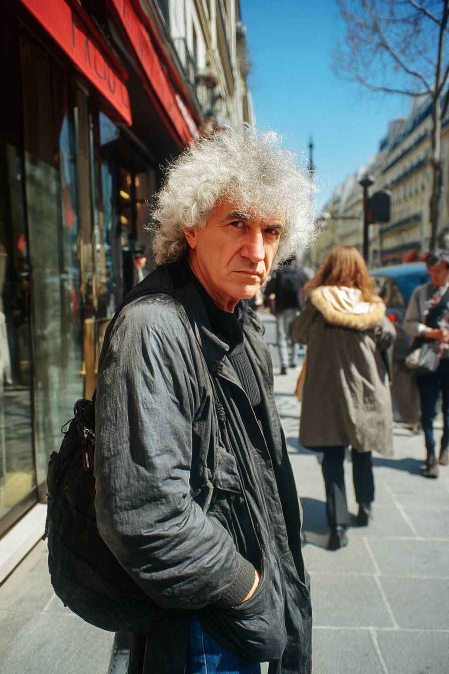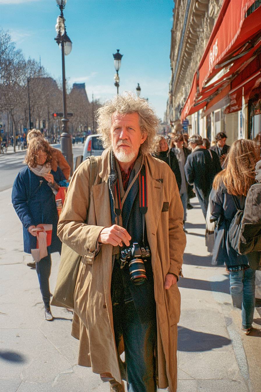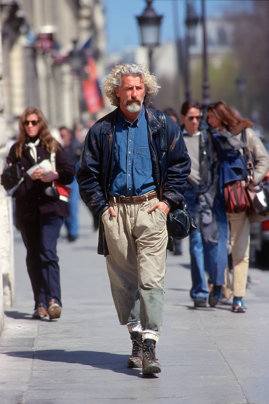 1990s medium-full street style fashion photo shot on Kodak 500T capturing a rugged 50-year-old man with curly gray hair, 5-o'clock shadow, and a stern look walking down the sidewalk on a bright spring morning in Paris. He's wearing --v 7.0 --ar 2:3 --p e8qdz8b