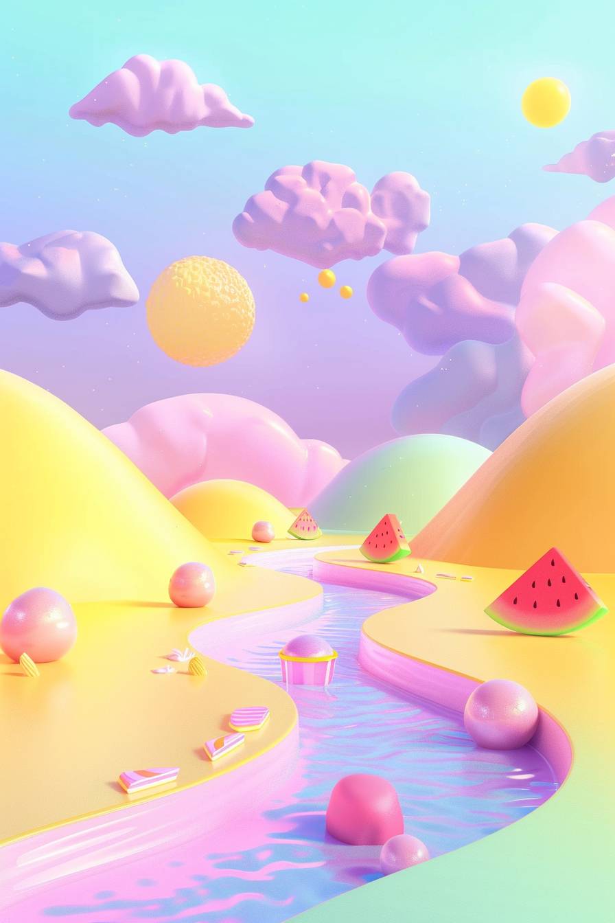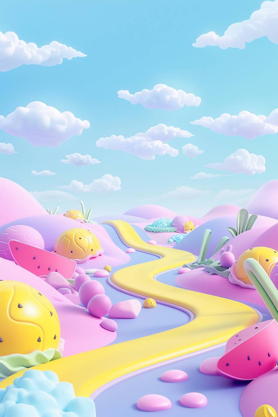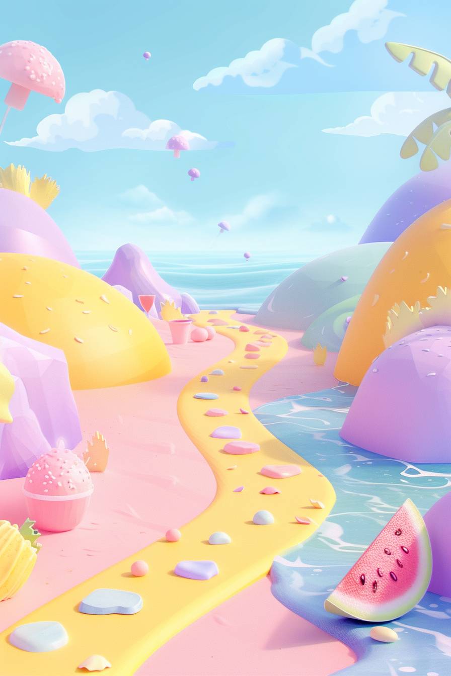 Colorful and happy pastel minimalist background, childish, for summer camp for young children, joy, light, freshness, watermelon, ice cream, sea, summer, freedom, path, track, colors yellow, light blue, purple, 3D, anime, cartoon made of clay, quality high --ar 2:3 --v 6.0