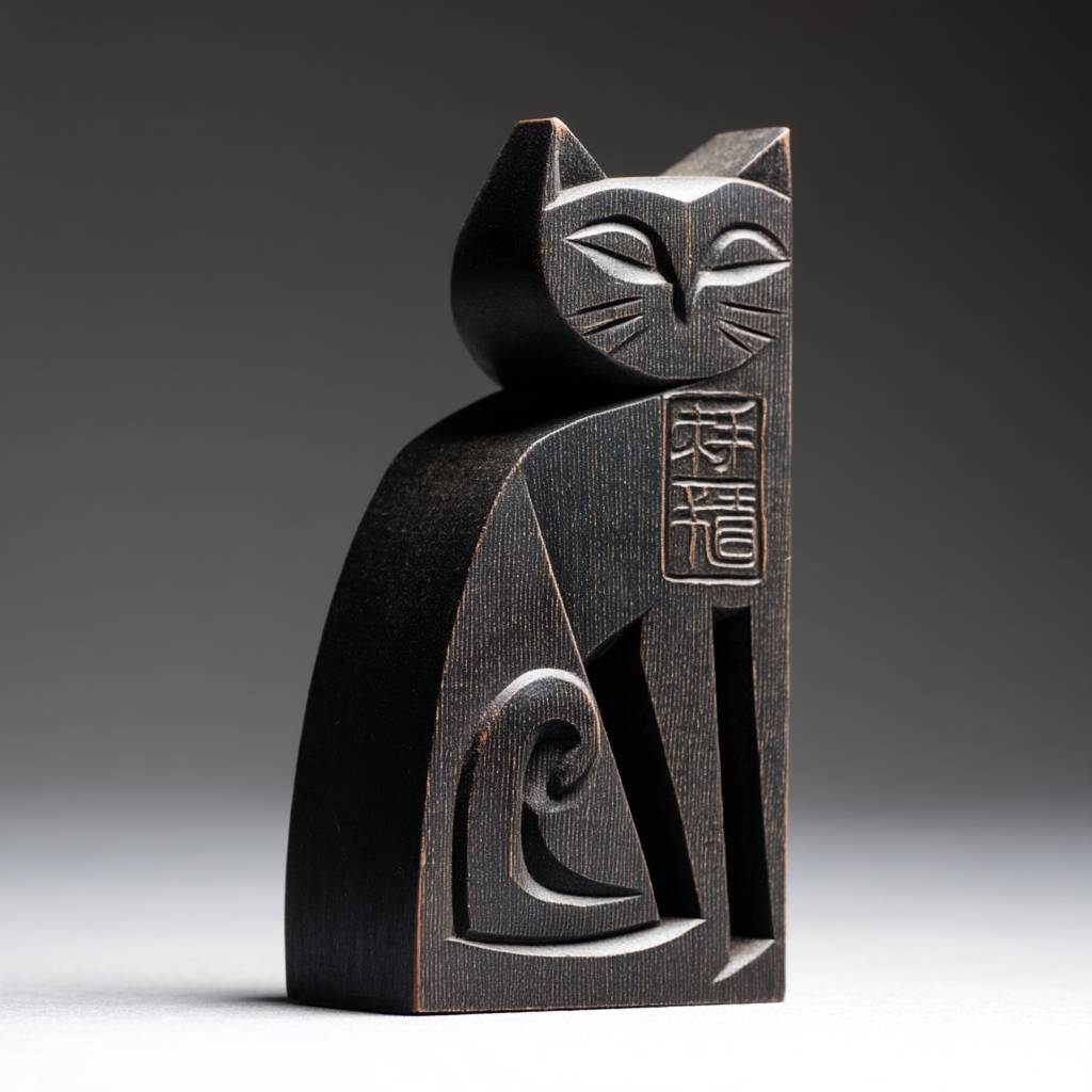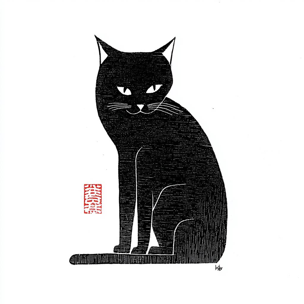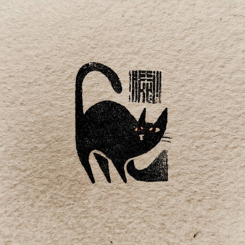 Um selo de tinta japonês com um gato preto no estilo de Gerd Arntz.