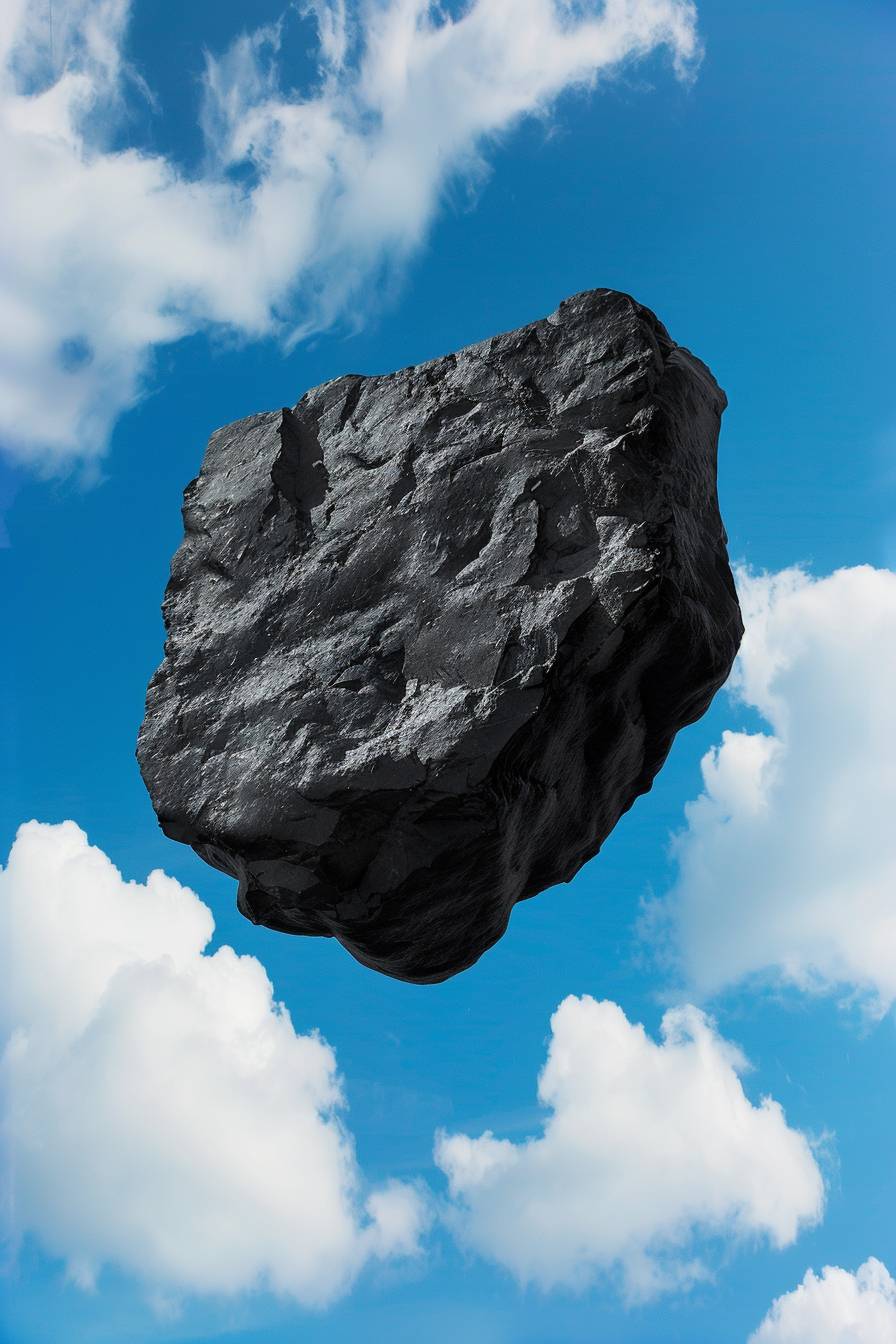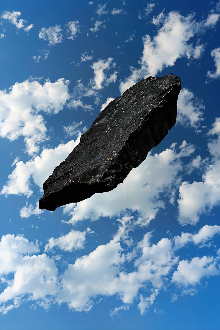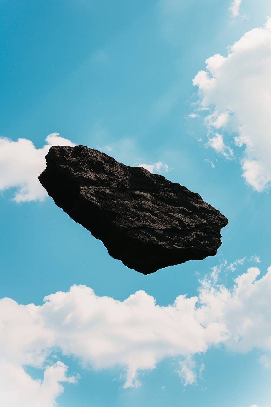 black old sharp torn black flat silhouette stone with uneven edges, floating over the bright blue cloudy sky --ar 2:3 --style raw --stylize 50 --v 6.0
