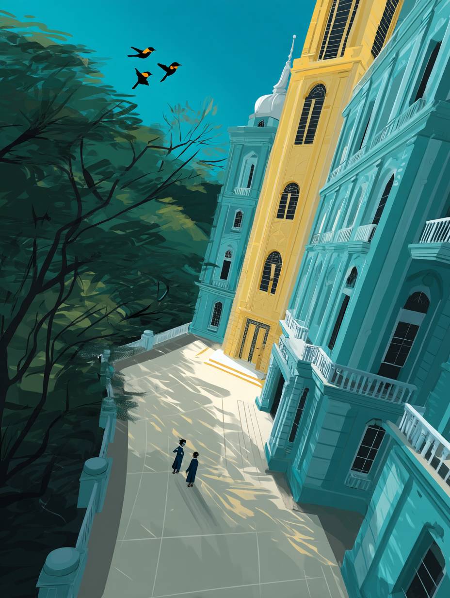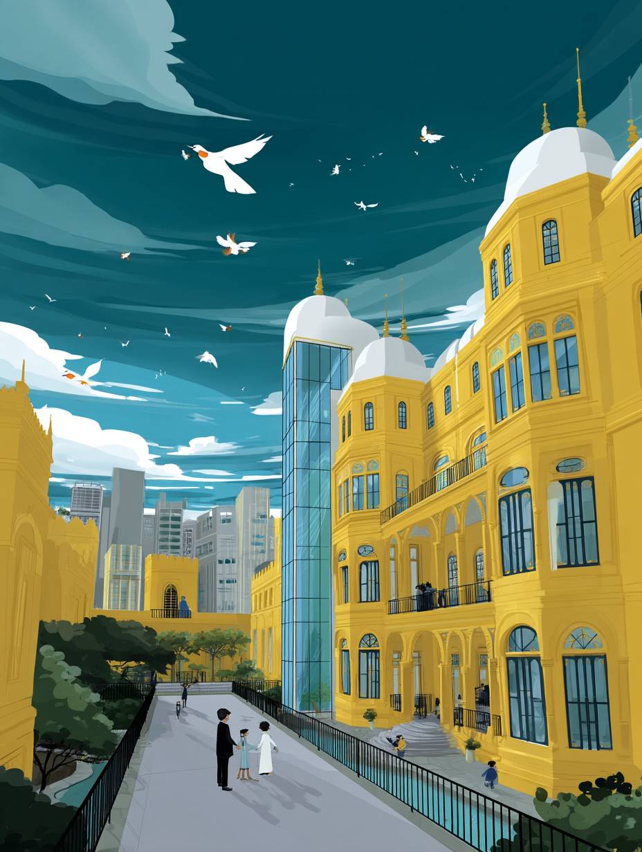 Liberdade, composição maximalista, visão aérea caprichosa de um edifício de estilo vitoriano em Karachi, Paquistão, crianças brincando, pintando e se divertindo no pátio, cute ruições voando, crianças brincando com gatos, regando plantas, observando tartarugas em um lago de tartarugas e peixes.