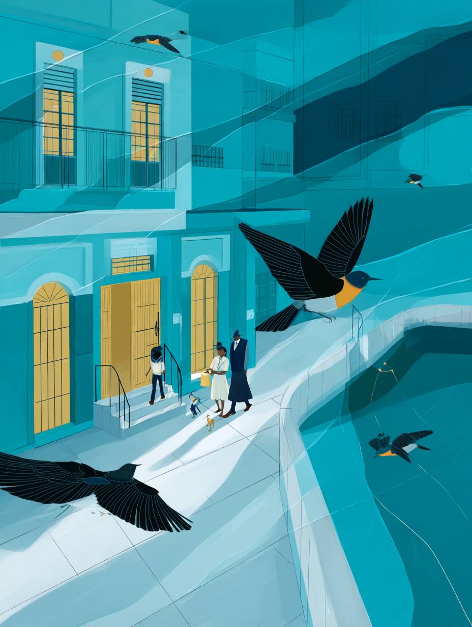 Freedom, Maximalist composition, Whimsical Birds Eye view of a Victorian style building in Karachi Pakistan, children are playing painting and having fun in courtyard, cute robins flying, children playing with cats, watering plants, watching turtles in a turtle and fish pond --chaos 30 --ar 3:4 --sref 7000 --sv 4 --stylize 1000 --v 7.0 --p semv7u6