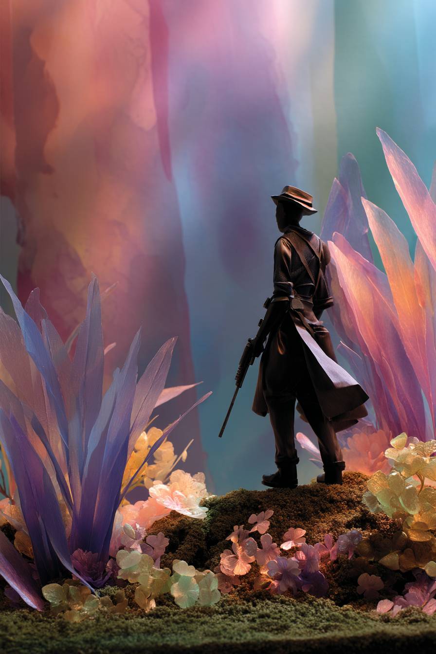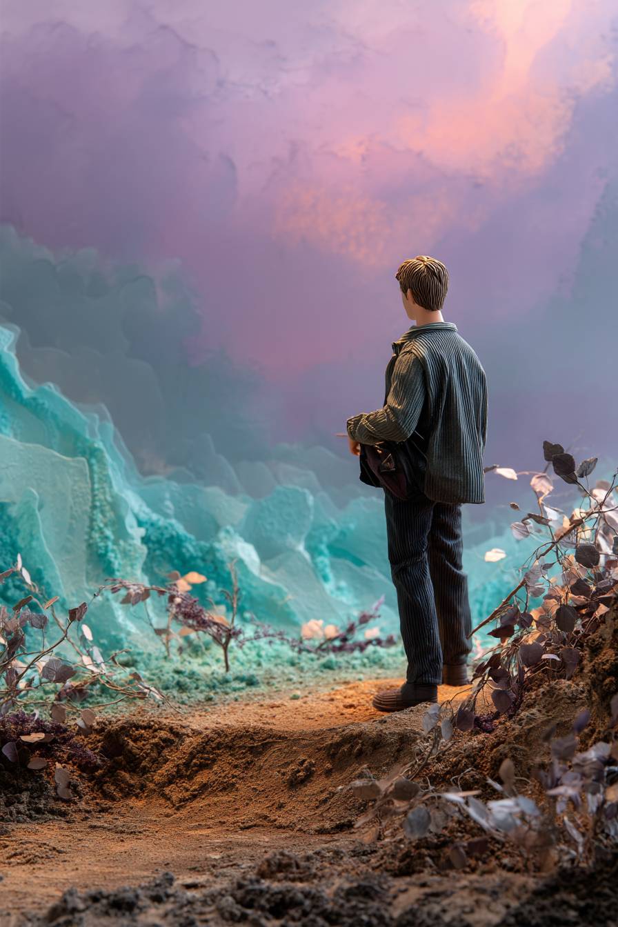 Um [sujeito] ao estilo claymation, esculpido com impressões digitais ásperas, imperfeições pintadas à mão e manchas. Ambientado em um diorama de texturas terrosas e fundos em tons pastéis, conferindo-lhe uma sensação tátil e artesanal.