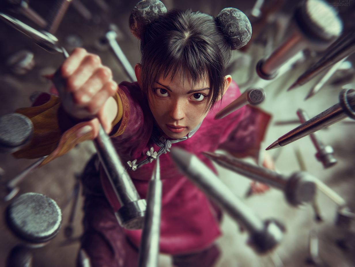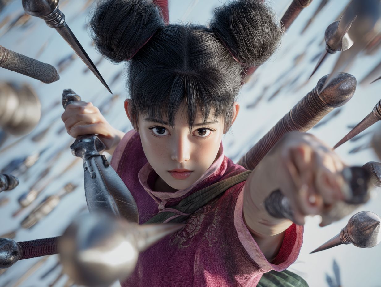 Uma imagem renderizada em 3D hiper-realista capturando Tenten de Naruto como uma mestre de armas. Renderizada com a textura de uma fotografia tirada com uma câmera Hasselblad, a imagem apresenta detalhes extremos e cores realistas. Tenten tem um olhar focado e uma expressão determinada influenciada pelo estilo de Hajime Isayama, além de uma textura de pele incrivelmente realista e um penteado característico de coque duplo, com cada cabelo claramente visível. Ela veste roupas de estilo chinês hiper-realista com texturas e dobras realistas. Ela está em uma pose dinâmica, como jogando kunai a uma velocidade rápida ou invocando um grande número de armas de um pergaminho. Rodeada por uma variedade de armas representadas em detalhes hiper-realistas, como kunais metálicos brilhantes, shurikens, espadas, etc., que voam ou giram no ar com efeitos de desfoque de movimento realistas. O pergaminho desenrolado também é renderizado em detalhes realistas, com a textura do papel claramente visível. Toda a cena é renderizada em detalhes de octano, e a luz e a sombra são cuidadosamente organizadas por iluminação profissional para destacar o volume e o movimento de Tenten, bem como a nitidez e o número de armas. A imagem é aprimorada para um nível de super-detalhamento. A composição simula o amplo ângulo de visão capturado pela câmera laser IMAX, mostrando Tenten e as muitas armas ao seu redor, trazendo um impacto visual cinematográfico. O ambiente de fundo pode ser um campo de treinamento destruído por armas, aumentando ainda mais a atmosfera de combate da imagem.