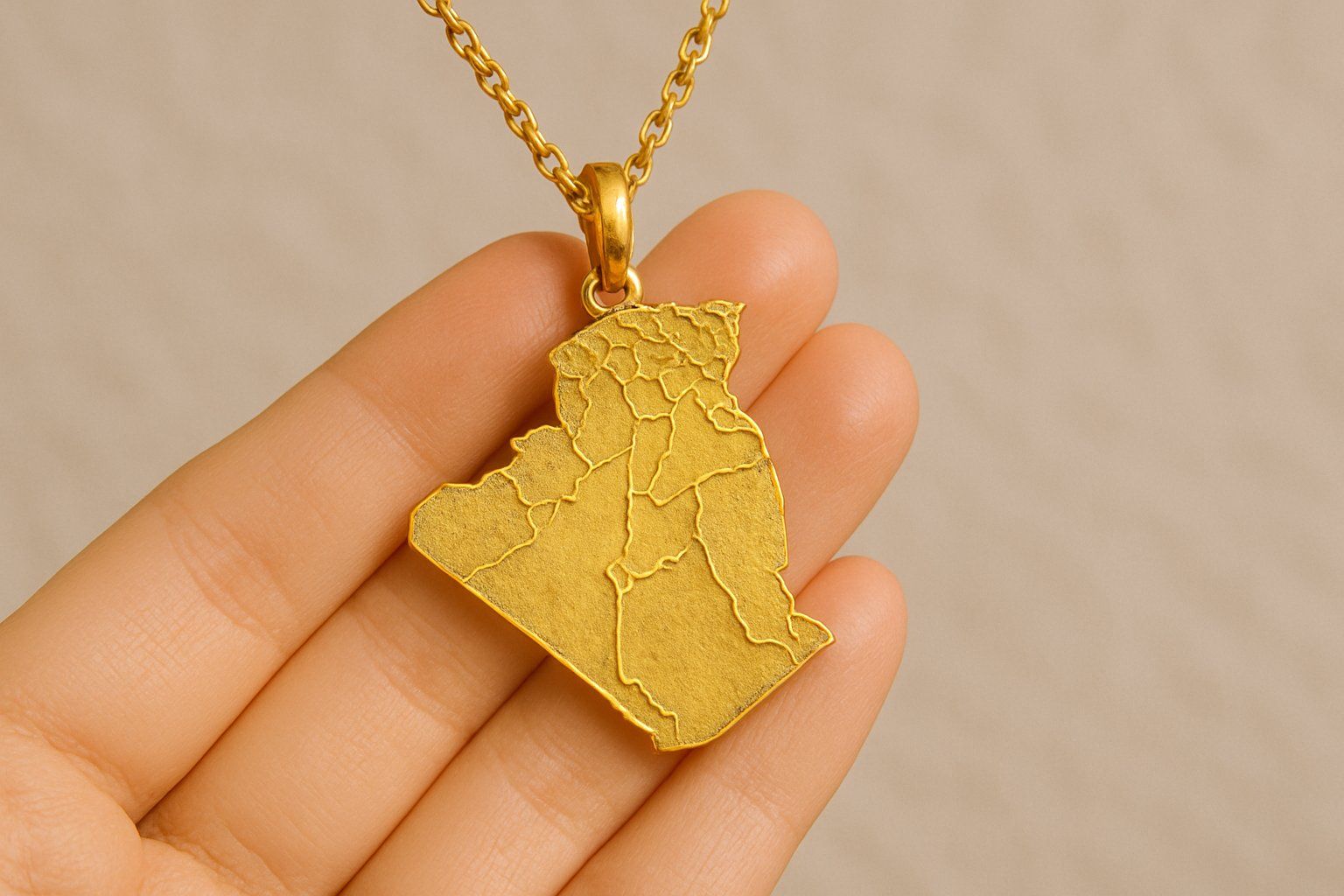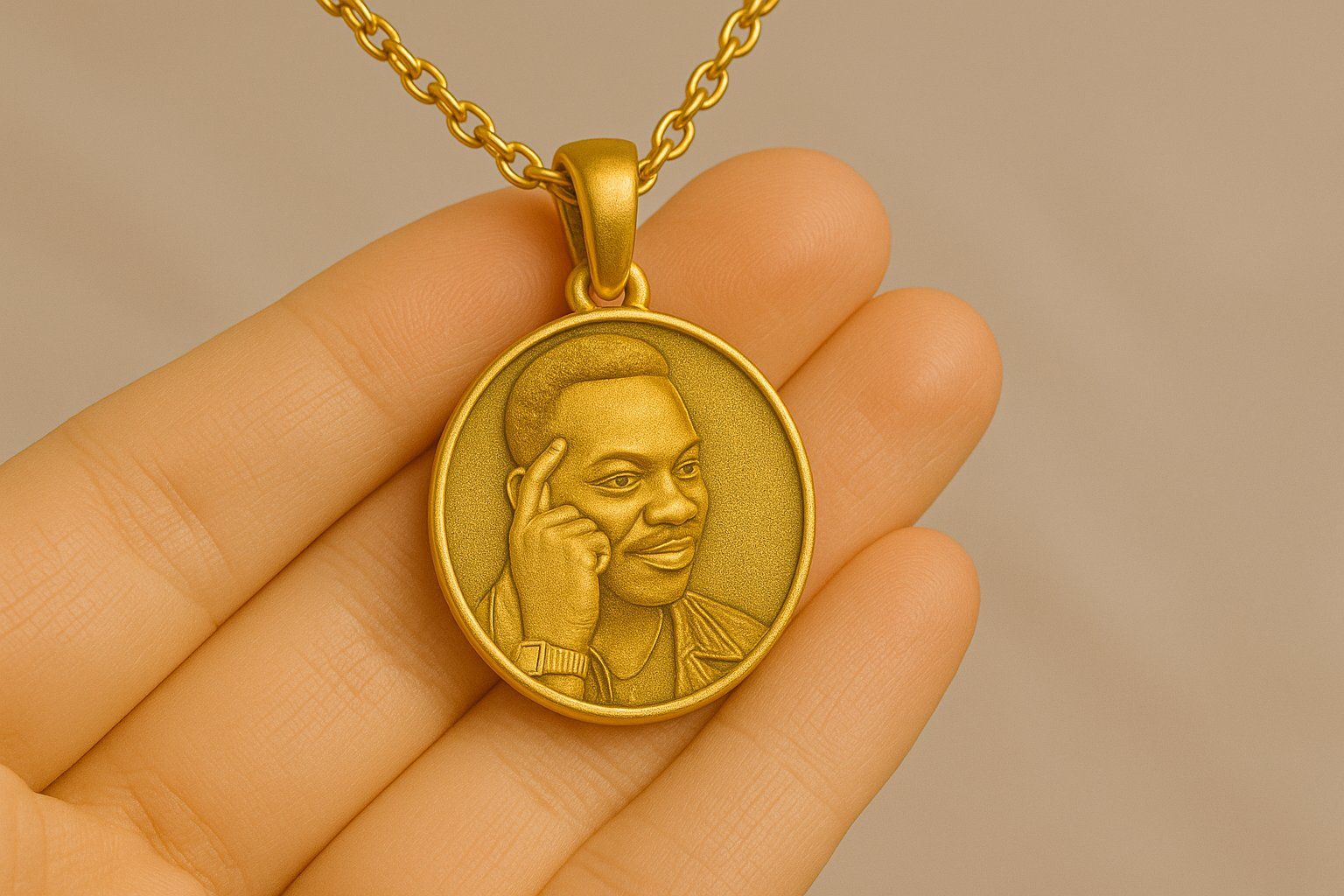 A photorealistic close-up of a gold pendant necklace held by female hand. The pendant features a bas-relief engraving of [image /emoji]. The pendant hangs from a polished gold chain. The background is softly blurred with neutral beige tones, and natural lighting, realistic skin tones, Product photography, 16:9 aspect ratio.