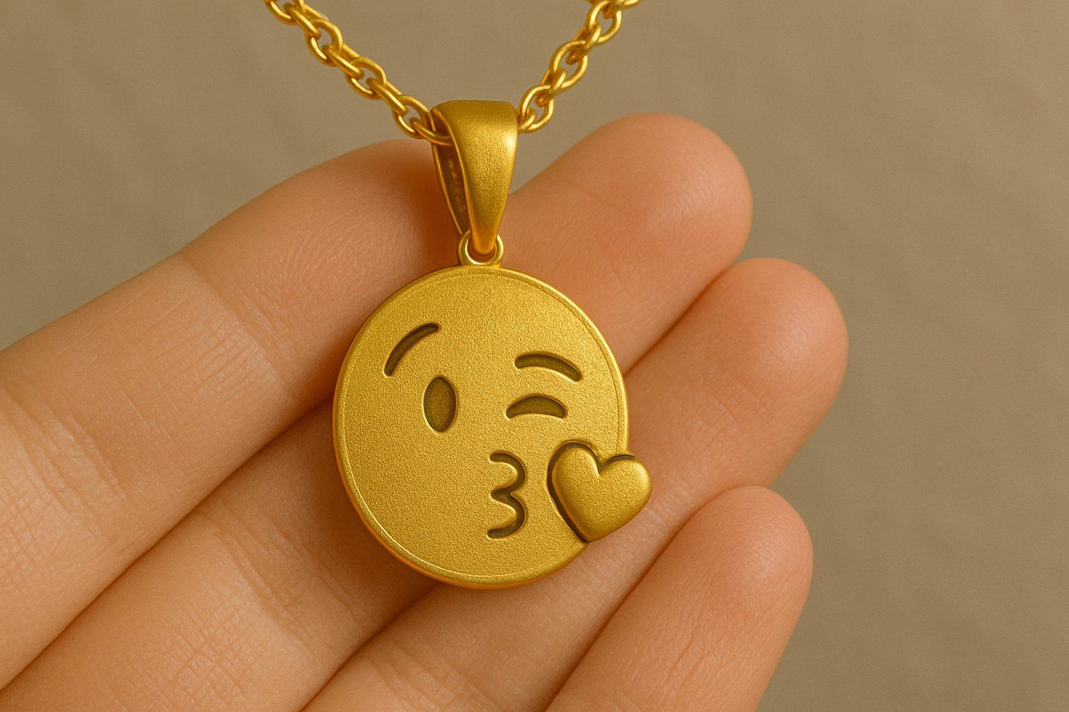 Um close-up fotorrealista de um colar de pingente de ouro segurado por uma mão feminina. O pingente apresenta uma gravação em relevo de [imagem/emoji]. O pingente pendura-se de uma corrente de ouro polido. O fundo está suavemente desfocado com tons de bege neutros, iluminação natural, tons de pele realistas, fotografia de produto, proporção de aspecto 16:9.