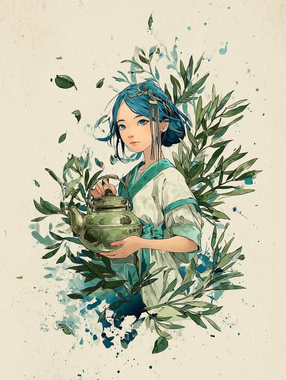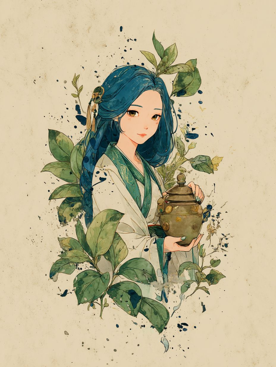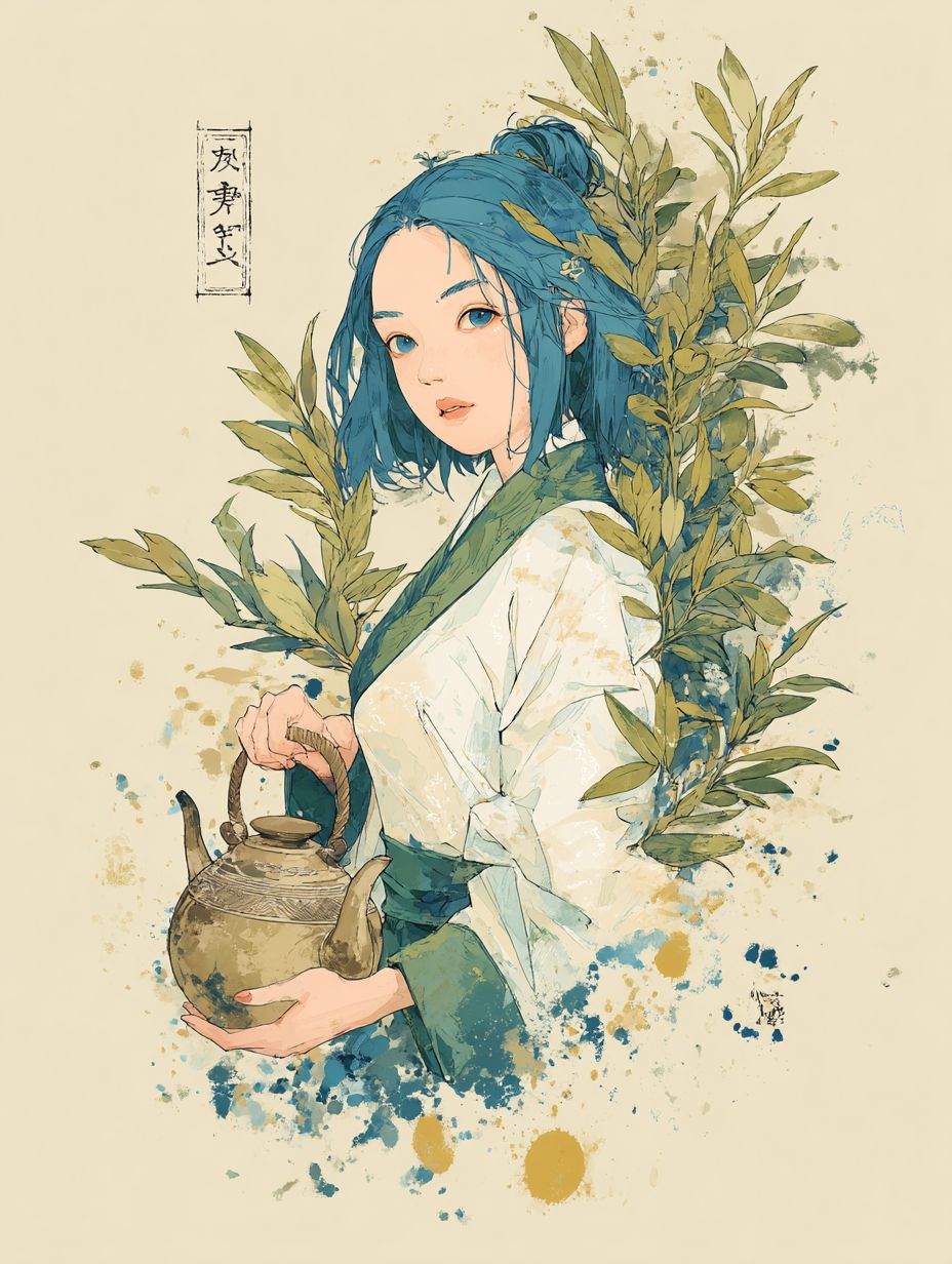A beautiful girl with blue hair wearing traditional Chinese in white and green, holding an ancient Chinese teapot, surrounded by leaves, in the style of an ink painting with splashes of watercolor on a beige background, in a flat design, high resolution, professional photography, sharp focus, and studio lighting. --ar 3:4 --v 7.0