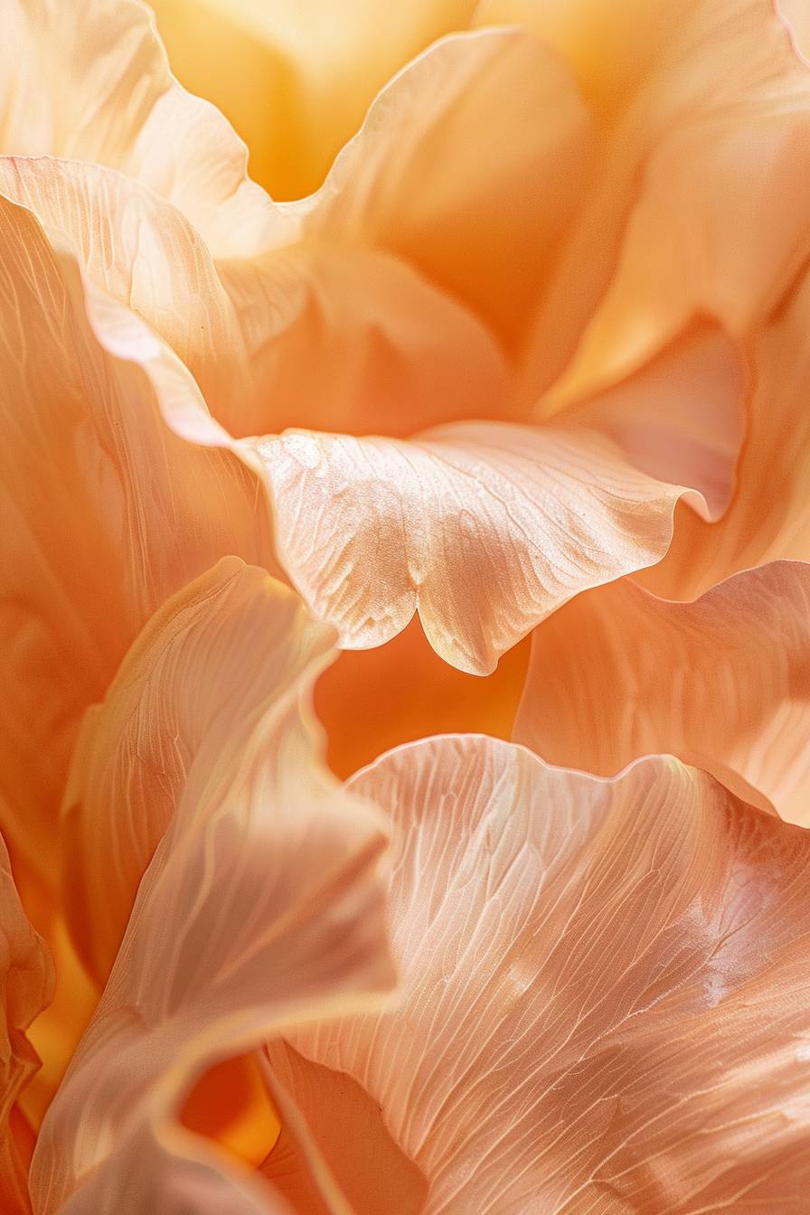 Closeup of petal material, soft peach pantone color background, semitransparent, translucent petals with subtle yellow accents, blurred edges, macro photography style, Nikon D850 used for high-resolution details and texture, focusing on the delicate textures of flower petals. --ar 85:128 --v 6.0