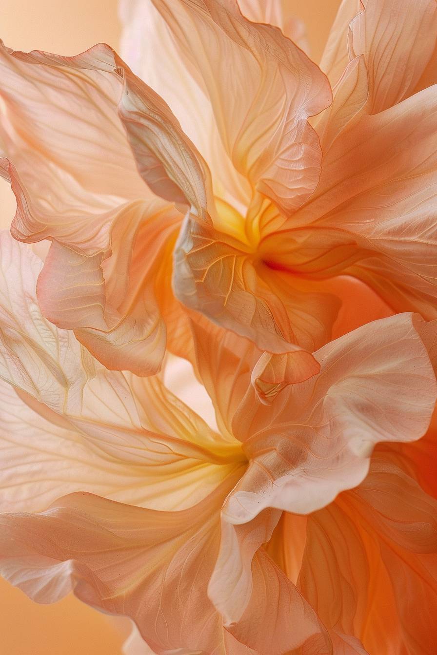 Close-up de pétalas em tom pêssego suave com textura translúcida e sutis acentos amarelos, focando nos delicados detalhes em estilo de fotografia macro.