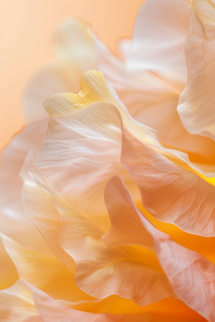 Close-up do material da pétala, fundo de cor pêssego suave pantone, pétalas semitransparentes e translúcidas com sutis acentos amarelos, bordas desfocadas, estilo de fotografia macro, Nikon D850 utilizada para detalhes de alta resolução e textura, focando nas texturas delicadas das pétalas de flores.