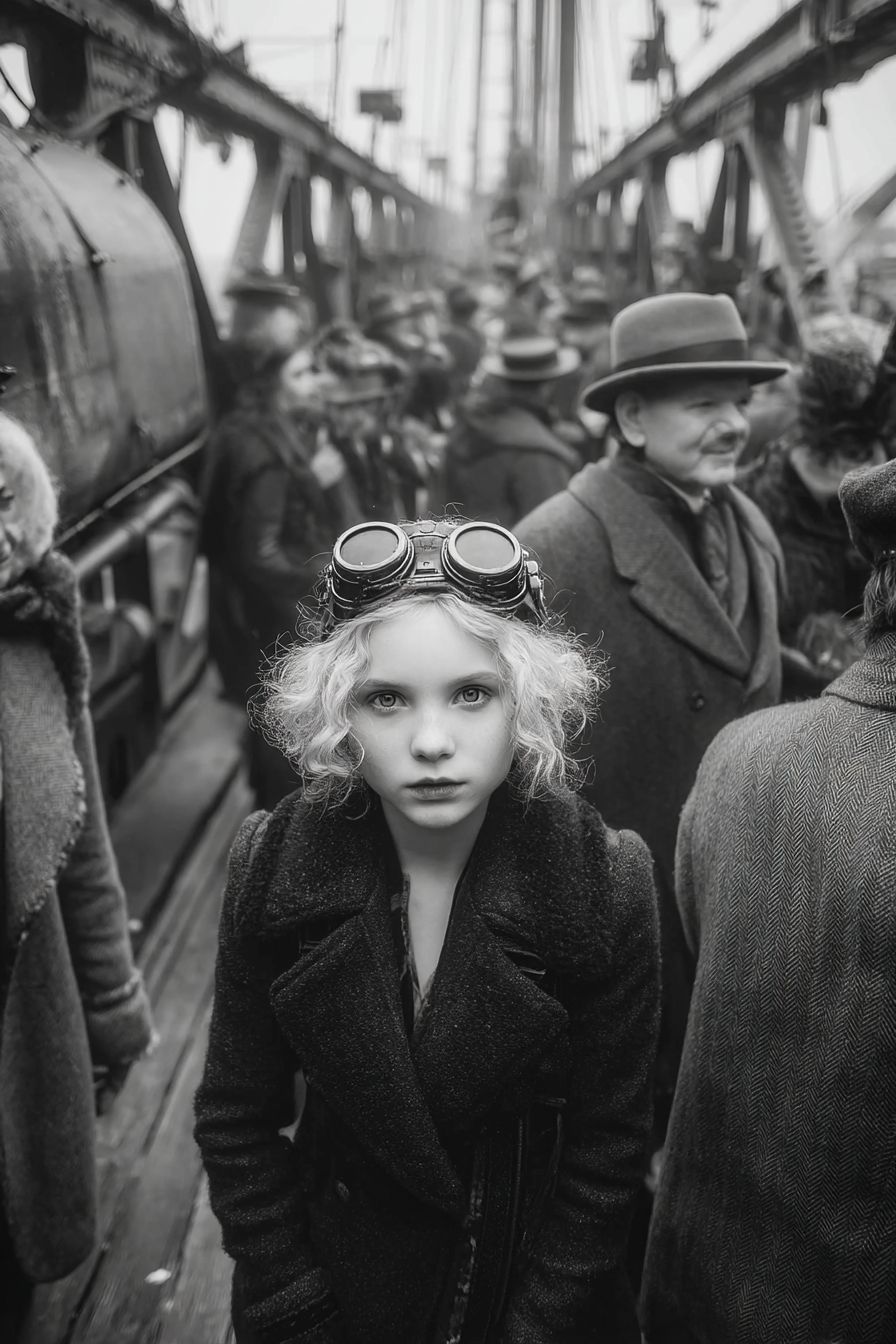 Black and white photograph. A cinematic still of an adventure comedy from the year 2056, featuring A little blond girl with goggles dressed in Victorian-era period costumes in steampunk standing on a futuristic bridge steampunk through a crowded train station full of people wearing various styles and outfits. Steaming pipes and smoking equipment surround the scene, and the woman is looking directly at the camera. The color grading gives the image a cinematic feel. --ar 2:3 --v 7.0 --s 250 --raw